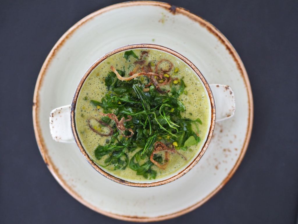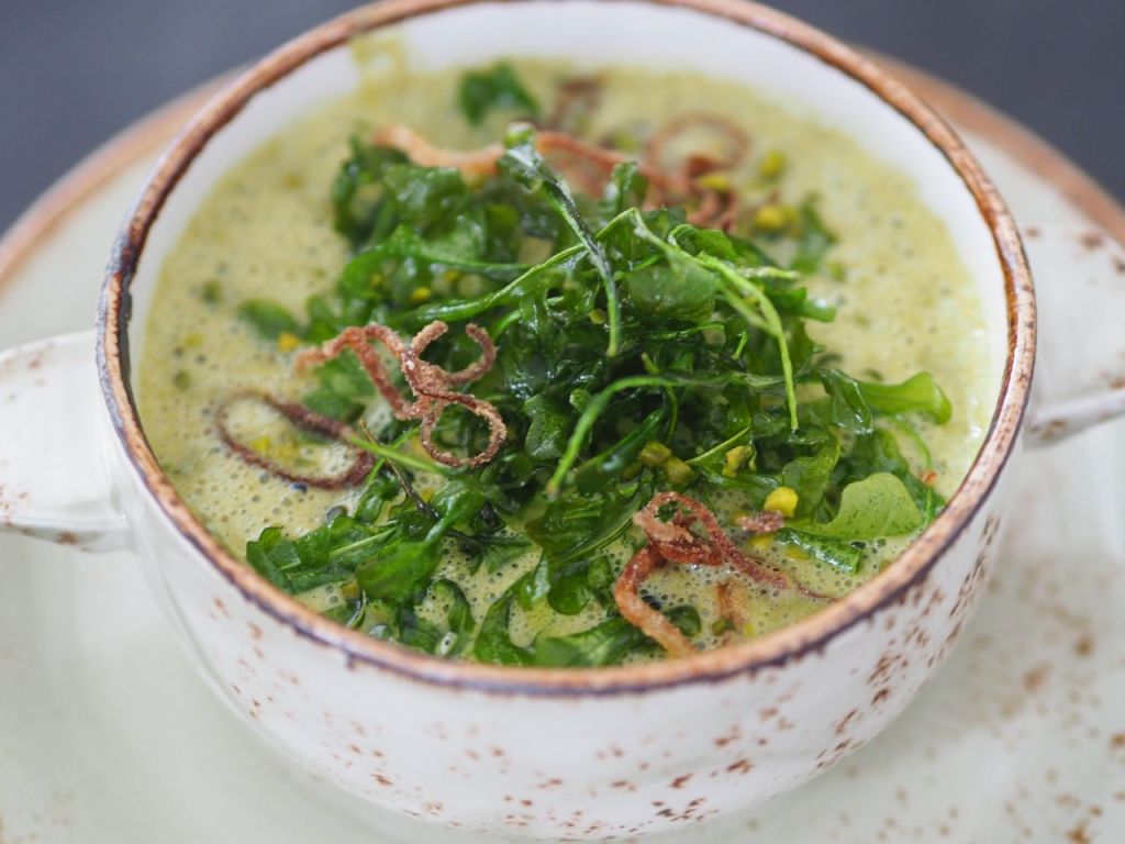 Zwei fein gehackte Schalotten eine fein gehackte Knoblauchzehe, 100 g gewürfelten Sellerie und 100 g gewürfelten Pastinaken, drei in Ringe geschnittene Frühlingszwiebel in zwei Esslöffel Olivenöl anschwitzen und mit 50 ml Weißwein ablöschen. Vier Kardamomkapseln dazu geben und mit einem Liter Gemüsebrühe aufgießen. Etwa 20 Minuten köcheln. Drei Handvoll Rucola, 100 Milliliter Sahne, einen kleinen Espresso dazu geben, noch mal aufkochen und im Mixer fein pürieren. Mit Salz abschmecken. Anrichten Schalotten in dünne Ringe schneiden, in Reismehl wenden und in Rapsöl frittieren, Rucolablätter ebenso frittieren. Suppe aufschäumen und mit den frittierten Rucolablättern und Schalottenringen belegen.