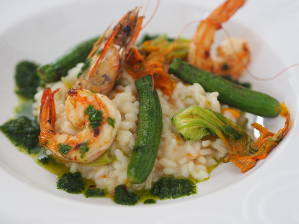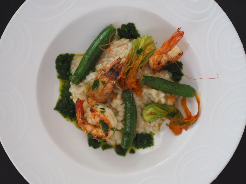 Zwei fein gehackte Schalotten in Olivenöl anschwitzen. 200 Gramm Risotto dazu geben, kurz mit dünsten, mit 200 Milliliter Weißwein aufgießen und verkochen lassen. Unter ständigem Rühren nach und nach Hühnerbrühe dazu geben, etwa 20 Minuten lang. Wenige Minuten vor dem Ende etwa drei kalte Butterflocken dazu geben und sieben Zucchiniblüten unterheben, das Risotto ruhen lassen. Zum Schluss den Grano Padano dazu geben und mit etwas Zitronensaft, Salz und Pfeffer abschmecken. Garnelen In der Zwischenzeit die Garnelen und die Minizucchini mit zerdrückten Knoblauchzehen in Olivenöl anbraten. Und die Zucchiniblüten in einer weiteren Pfanne frittieren. Anrichten Das Risotto auf einen Teller geben, die Garnelen und die Minizucchini auf dem Reis verteilen, mit der frittierten Zucchiniblüte garnieren und mit Petersilienöl beträufeln.