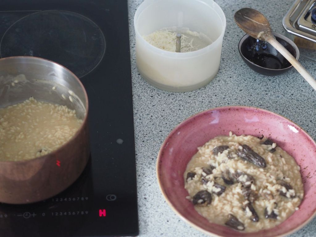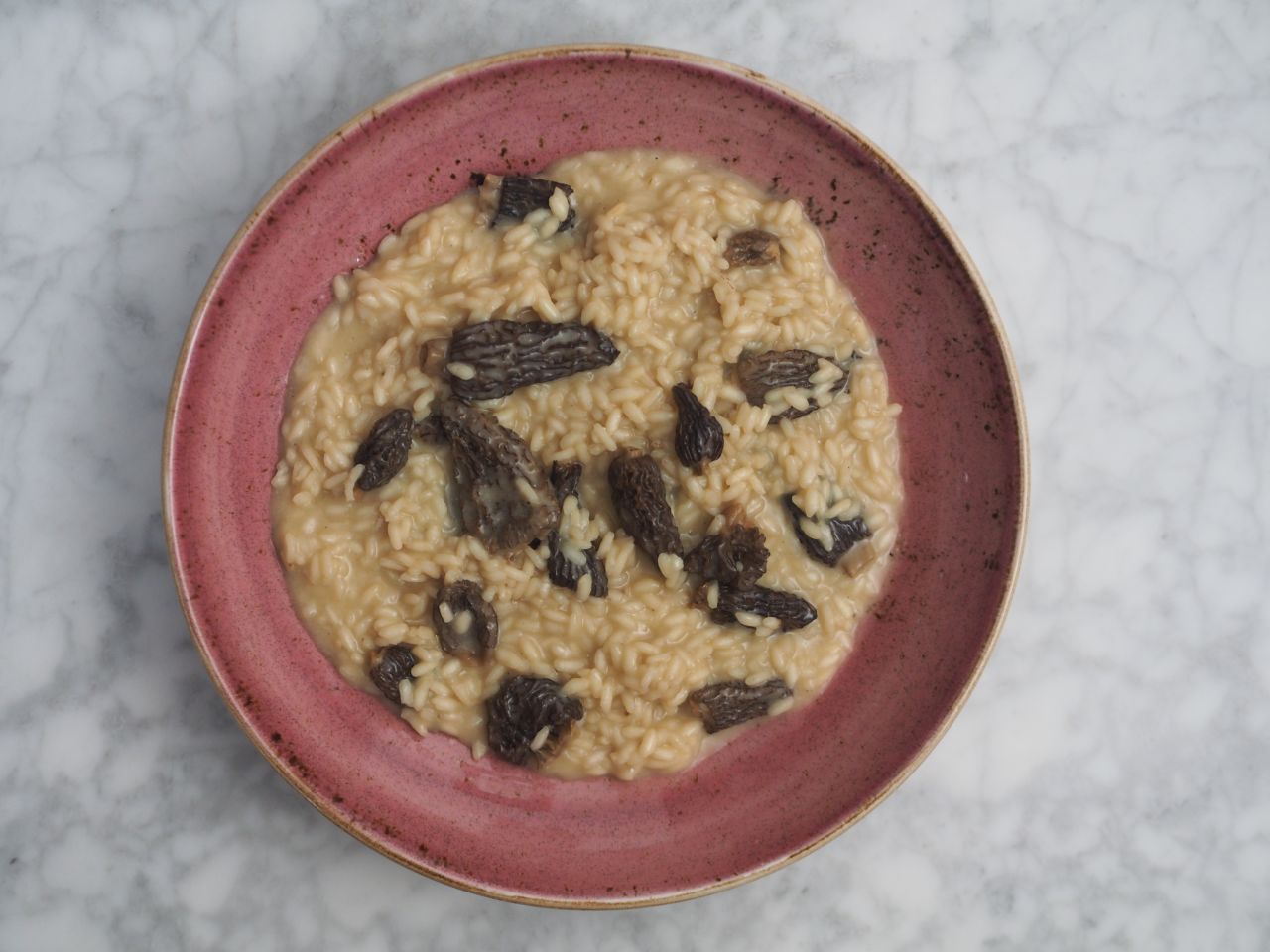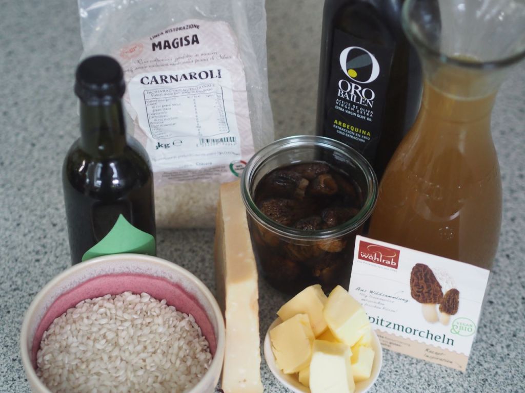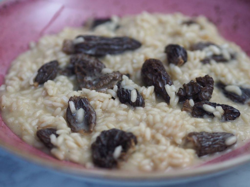 15 g getrocknete Morcheln mit 100 ml heißem Wasser aufgießen und eine Viertelstunde ziehen lassen. Anschließend durch eine Teefilter abseihen. Den Morchelsaft auf die Seite stellen und die Morcheln mit Wasser abspülen und abtropfen lassen. Einen EL Olivenöl in einem Sautoir erwärmen. 160 g Risottoreis (Carnaroli von Magisa) dazugeben und anschwitzen bis der Reis Perlenfarbe angenommen hat. Mit einem Achterl Verjus ablöschen und einköcheln lassen unter ständigem Rühren. Dann den Morchelsaft dazu geben, einrühren, köcheln lassen. Dann die Morcheln dazu geben. Dann nach und nach bis zu einem halben L selbstgemachtemHühnerbrühe einrühren bis das Risotto bißfest ist. Das dauert circa 20 bis 25 Minuten. Dann vom Herd nehmen. Butter und Parmesan nach Gusto einrühren.