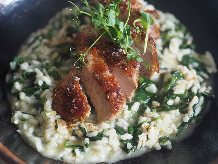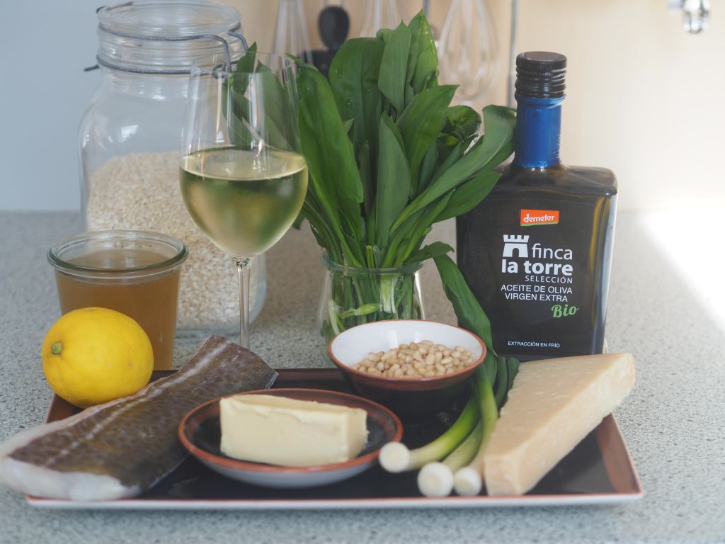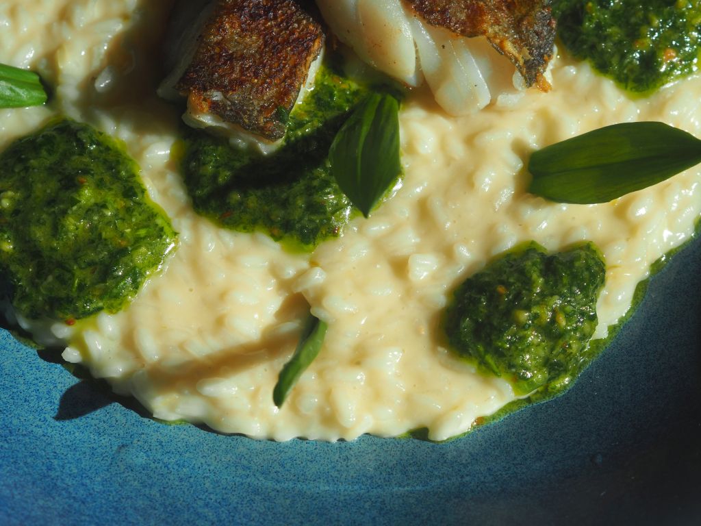 Risottorezept angeleitet von „Risotto mit Zander und Bärlauchpesto“ aus dem Buch „Risotto ti amo“, auf S. 163 von Ambrogio Stefanetti, Küchenchef und Besitzer der “Vecchia Osteria Seseglio” in Seseglio in der Schweiz, hart an der Grenze zu Italien.