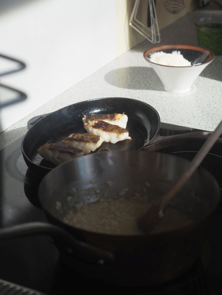 S k r e i Gegen Ende Skrei in der Pfanne auf der Hautseite braten. Wenn das Risotto fertig ist, vom Herd nehmen. Parmesan und Butter einrühren.