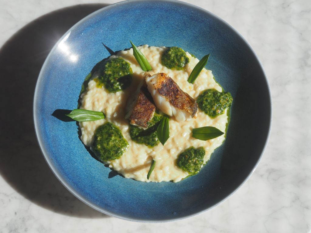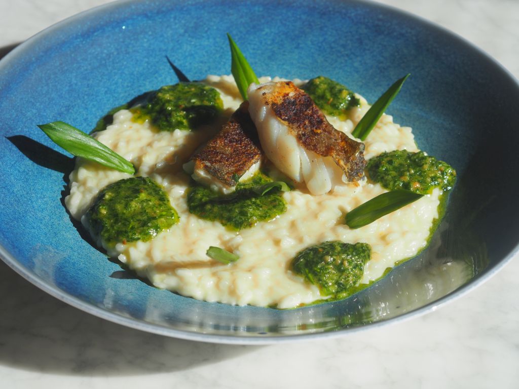 A n r i c h t e n Risotto auf dem Teller verteilen, mit dem Waldknoblauch-Pesto beträufeln, die Skreistücke darauf legen. Und mit den Waldknoblauchblättern garnieren.
