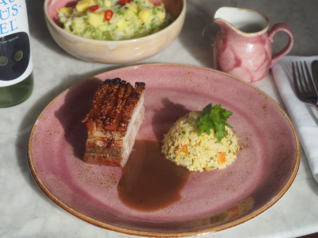 Wein Bei Wild geht nur Rotwein, das kommt mir sehr entgegen. Umathum, Cuvée Haideboden, 2021. Als erster Schritt noch vor der Rindsuppe wird der Wein zum Belüften in einen Dekanter gefüllt und auf die Seite gestellt. Der Wein kommt aus dem Burgenland, aber der Dekanter nebst Gläser aus dem Waldviertel, aus Gmünd von Zalto „Denkart“, vom Weinflüsterer Hans Denk. Das Glas zählt zu den 6 Dingen, die nicht mehr verbessert werden können, wie das Wall Street Journal ganz unbescheiden meint.