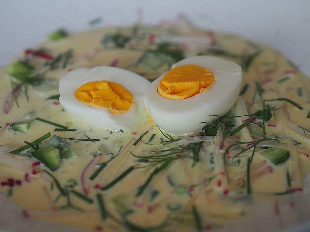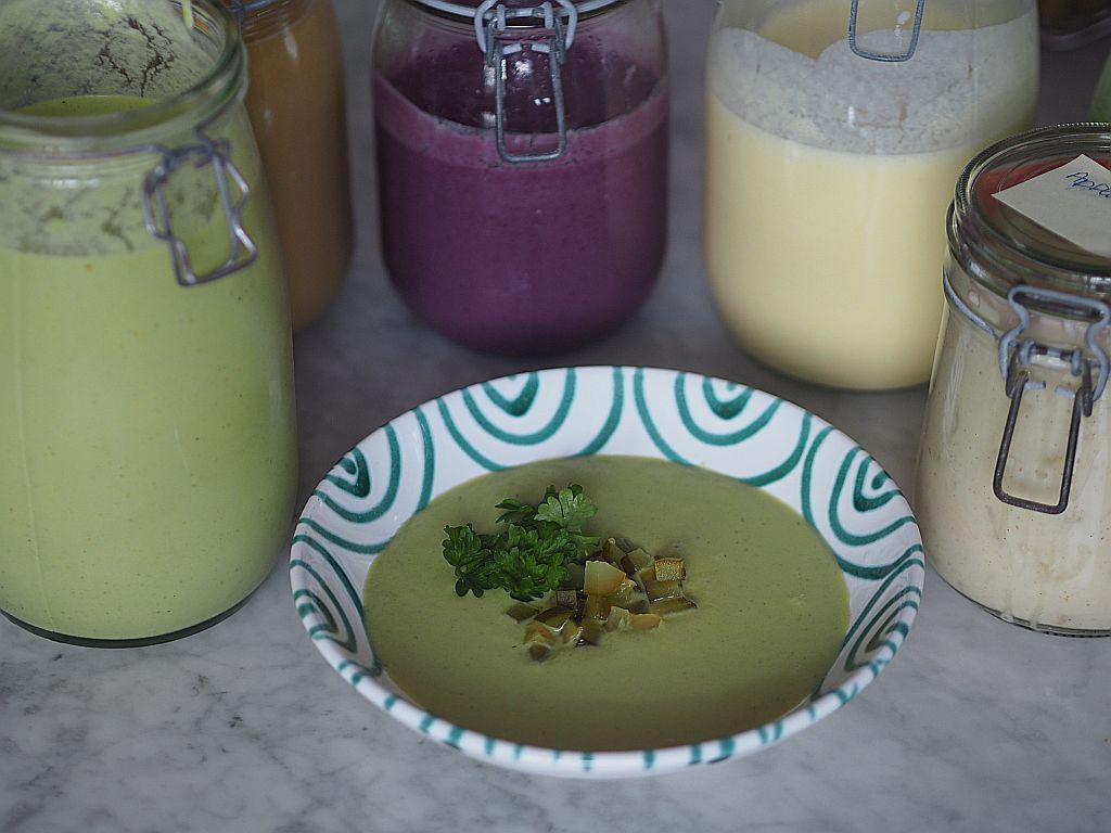 - Noch einmal das Hauptthema, das magere Meisl, in der Suppe. Neue Seitenthemen werden eingeführt: gelbe und rote Karotten, Stangensellerie, Kohlrabi, Petersilwurzel und Nudeln. Damit kommen wir unserem Ziel, 30 verschiedene Gemüsesorten pro Woche zu essen, einen gewaltigen Schritt näher.