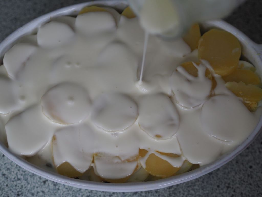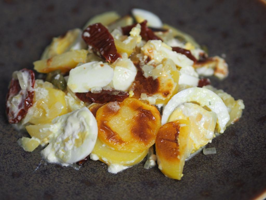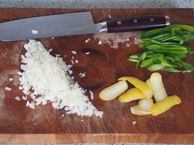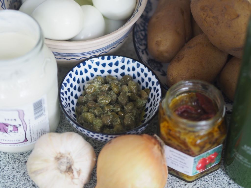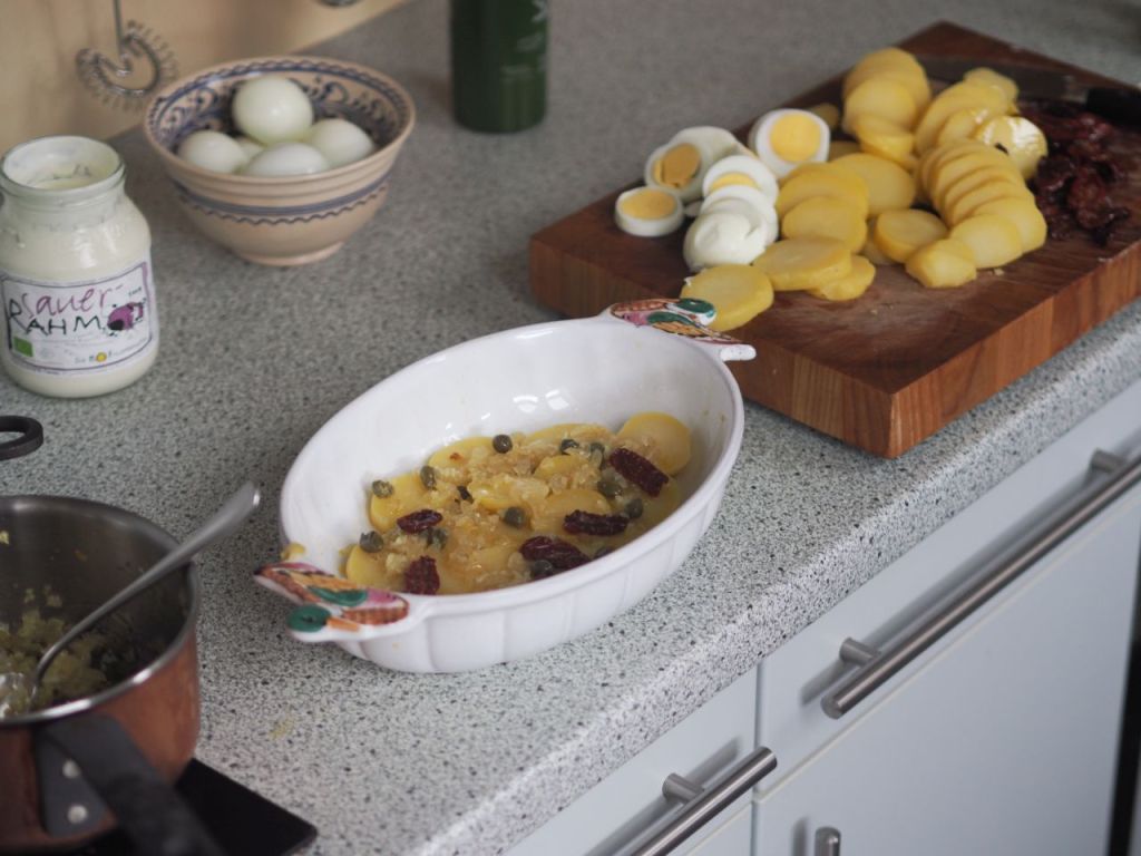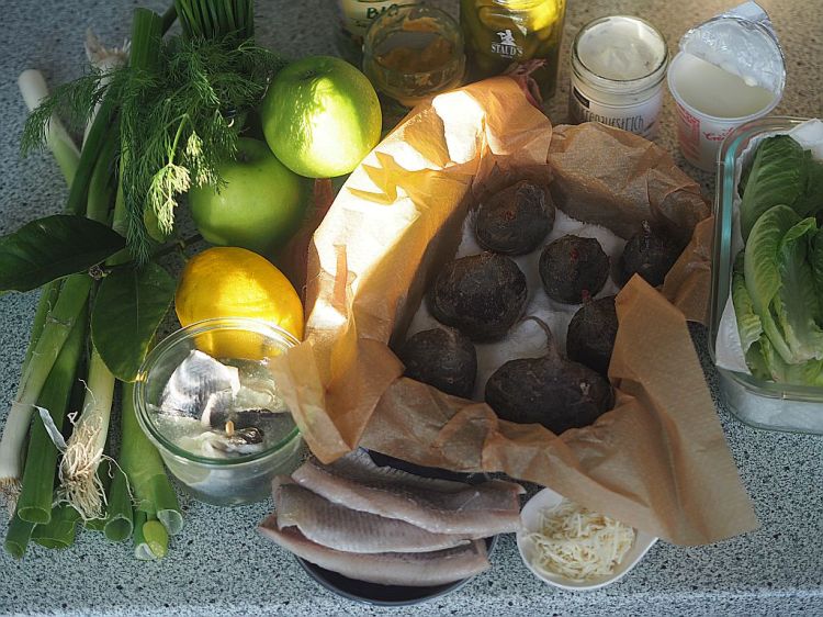 150 g Sauerrahm, 100 Schmand, 3 TL Dijonsenf, 1 TL Honig, 2 TL Zitronensaft, 2 TL weißen Balsamicoessig, Salz, schwarzen Pfeffer und 1 EL geriebene Zitronenschale miteinander gut verrühren. 4 in feine Scheiben geschnittene Jungzwiebel etwa 12 Stück in dünne Scheiben geschnittene Cornichons, 1 kleinen in Würfel geschnittenen grünen Apfel hineingeben und durchrühren. Matjesfilet in Stücke schneiden und dazugeben. Im Kühlschrank durchziehen lassen.