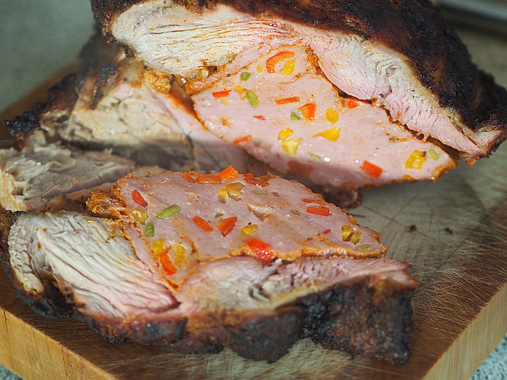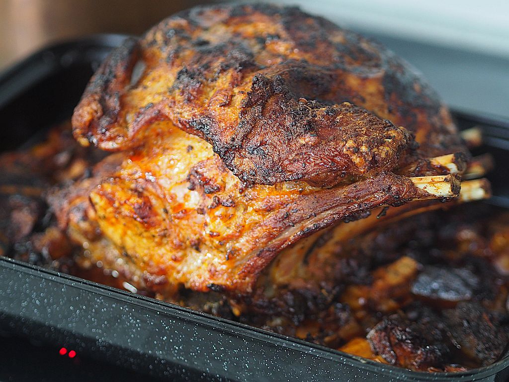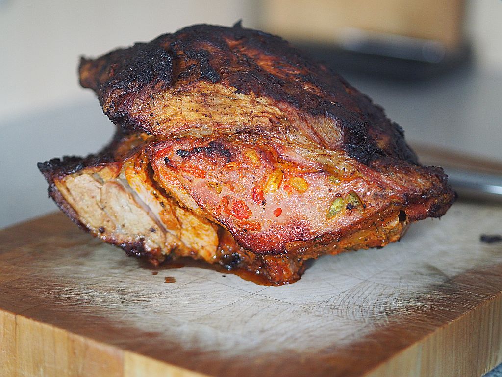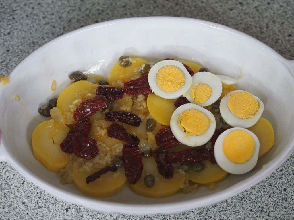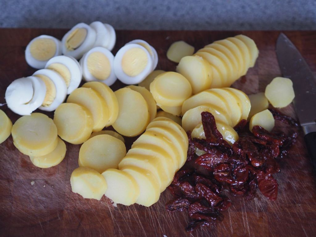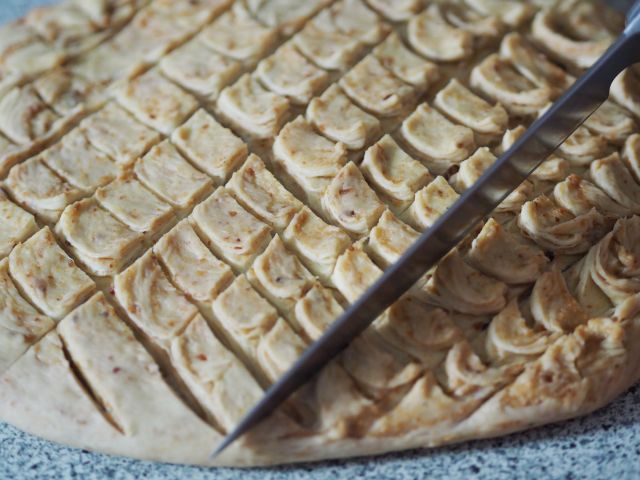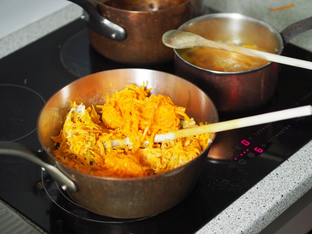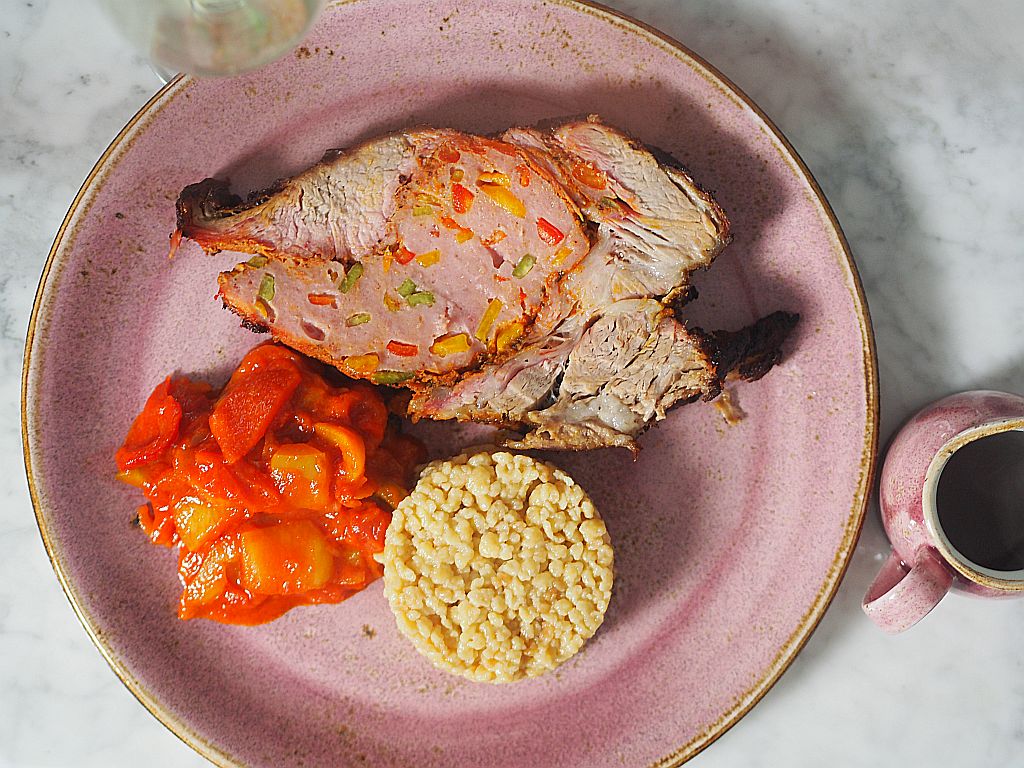 7 rote Rüben (Bete) auf einem Salzbett im Backrohr bei 100°C weichgaren. 300 g rote Zwiebeln in Scheiben schneiden und in einem EL Olivenöl anschwitzen. Mit 3 TL Honig karamelisieren. Mit 5 EL Apfelessig ablöschen. Einköcheln. Rote Bete schälen und in kleine Spalten schneiden. Rote Bete zu den Zwiebeln geben und kurz auf mittlerer Hitze ein bißchen ziehen lassen. Vom Herd ziehen.