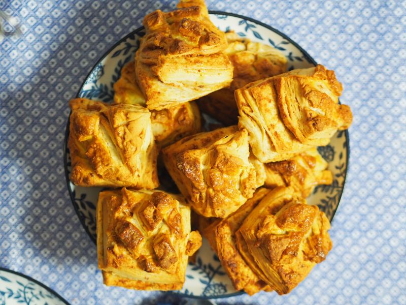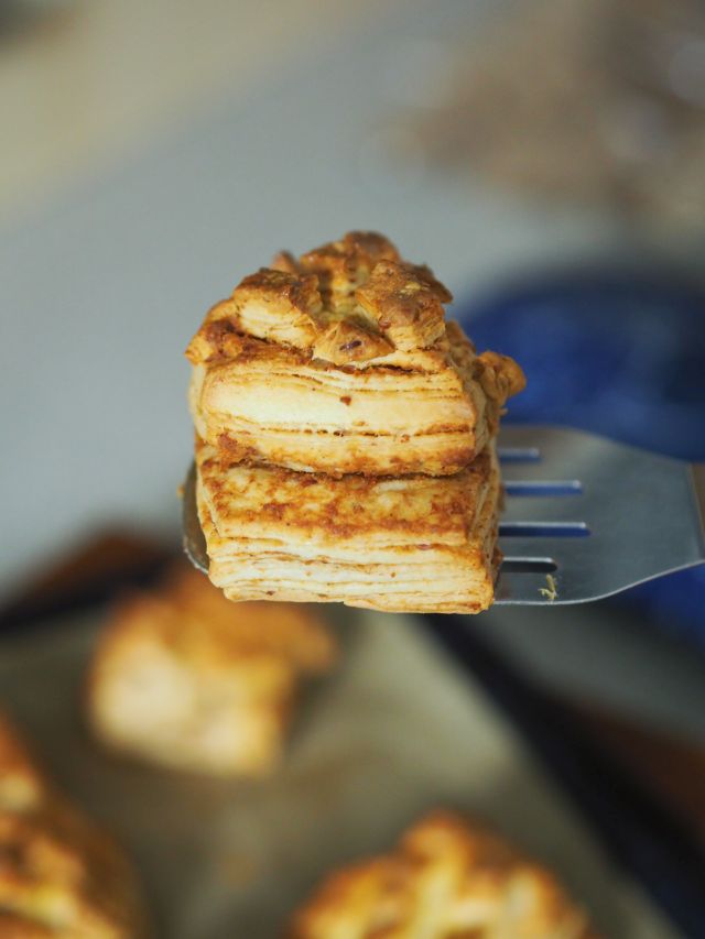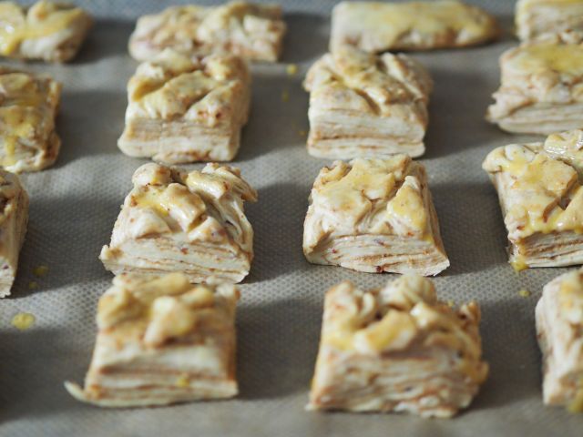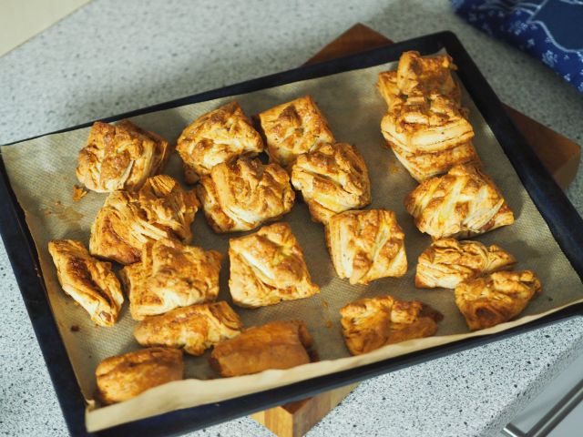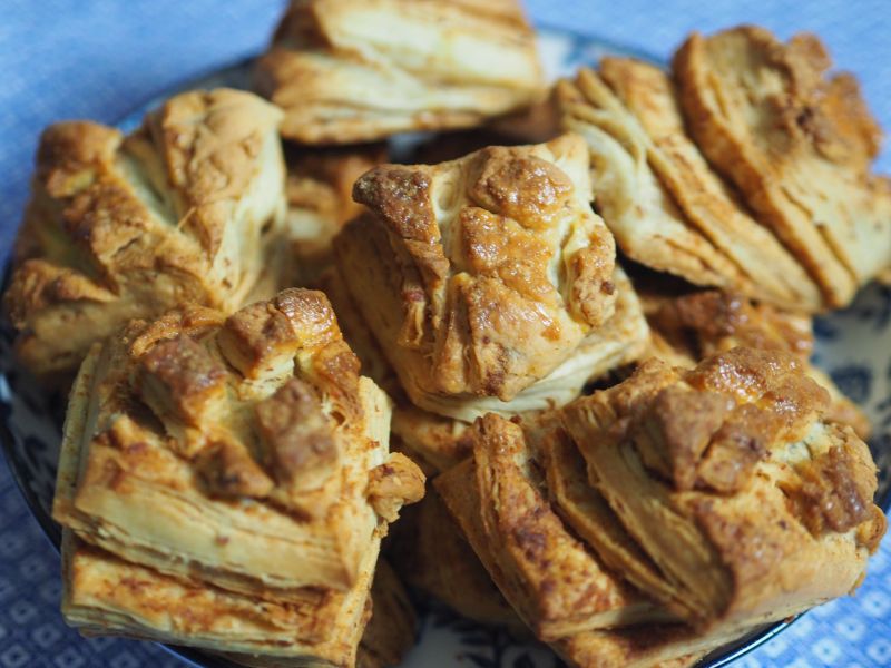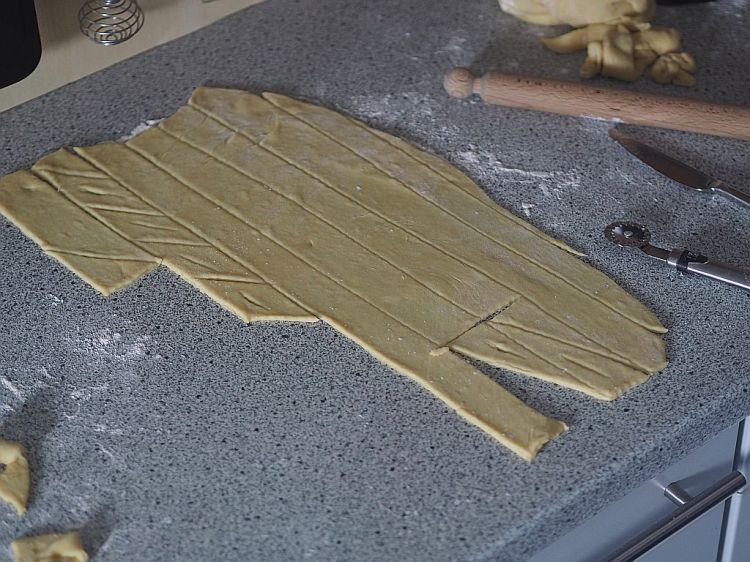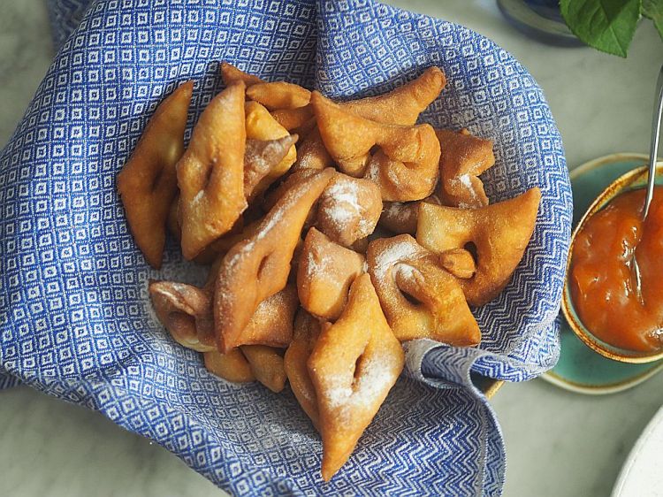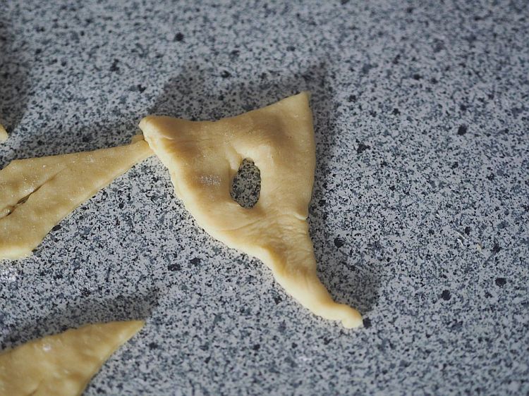 250 g Mehl mit 150 ml Sauerrahm, 3 Dotter, 50 g weiche Butter, 20 g Staubzucker, 1 TL Backpulver, und eine gute Prise Salz vermengen und daraus einen Teig kneten. Eine Viertelstunde eingepackt in Folie in den Kühlschrank geben. auf bemehlter Oberfläche dünn ausbreiten. Mit dem derelyevágó (Nudelschneider) in Rauten und Dreiecke schneiden. Bei den Dreiecken den Zipfel in die Lücke stecken, bei den Rauten nur in der Mitte eine Lücke machen. Dann ins Schmalz goldbraun ausbacken. Mit Staubzucker bestreuen. Marillenmarmelade servieren.