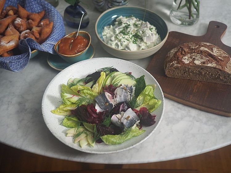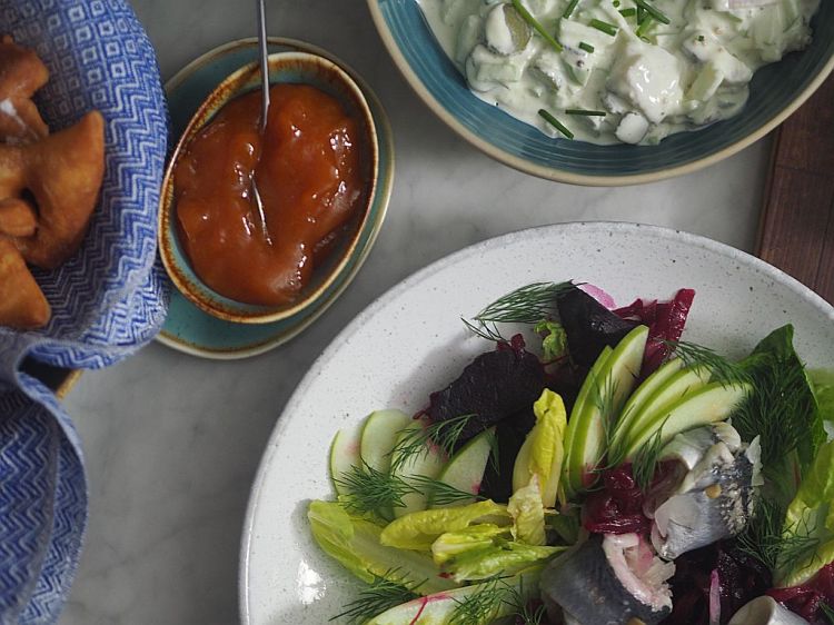 Einen kleinen Römersalat zerzupfen und auf dem Teller verteilen. Einen halben grünen Apfel ungeschält, entkernt in dünne Scheiben schneiden, zum Blattsalat geben. Blattsalat mit der Rote-Bete-Zwiebel-Mischung mischen. Mit Rollmöpsen garnieren. Und mit Dillspitzen bestreuen.