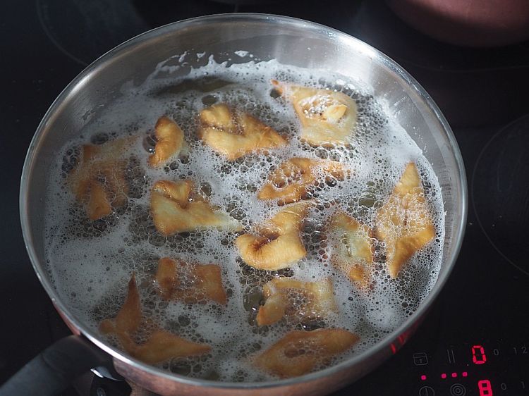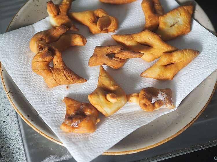 Csörögefánk, auf deutsch prasselnde Krapfen, werden in Ungarn so genannt, weil das Schmalz beim Backen so prasselnde Geräusche macht. Gibt es auch in Italien, Frankreich, Bulgarien, Polen, usw. Ich kannte sie bislang nicht. Schmecken sehr gut. Der Teig ist etwas anders als bei Krapfen sonst, keine Germ sondern Backpulver und sehr wichtig: Sauerrahm.