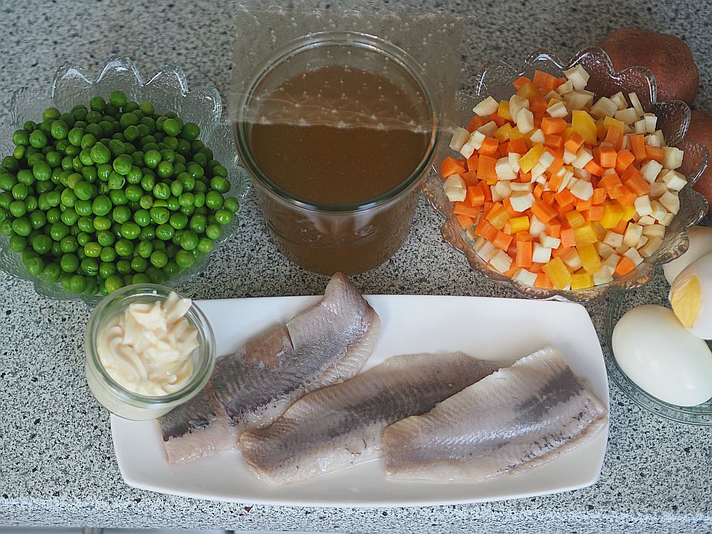 Für 4 große Schüsseln: 5 rote Karotten, 1 gelbe Karotte, 3 Erdäpfel, 300 g TK-Erbsen, 250 ml Sauerrahm, 10 EL Mayonnaise, 500 ml Rinderbrühe, 6 Blatt Gelatine, 4 Eier, 3 Heringe, Salz