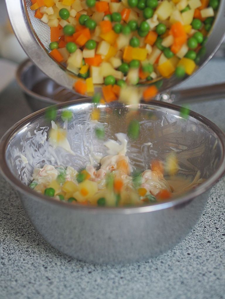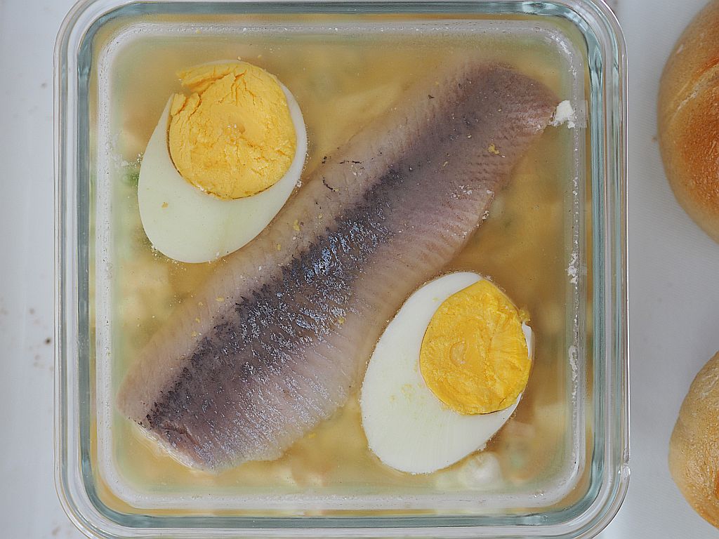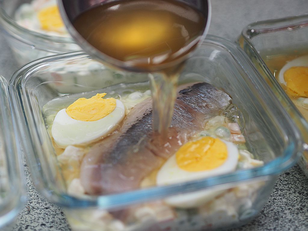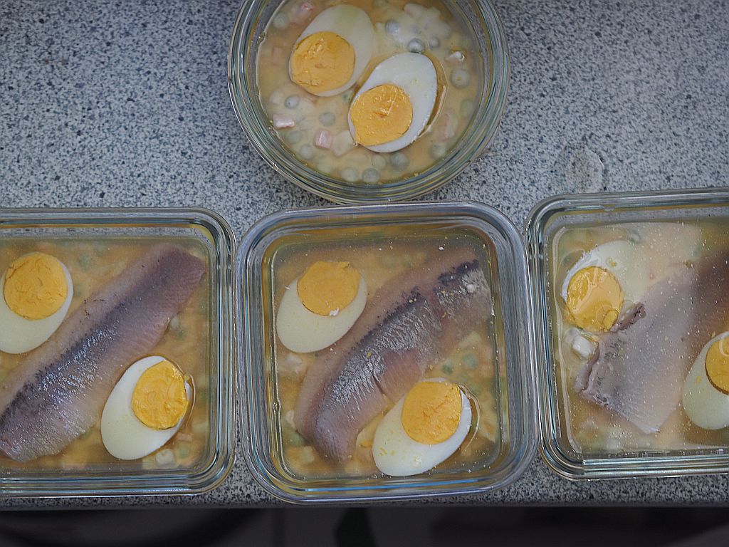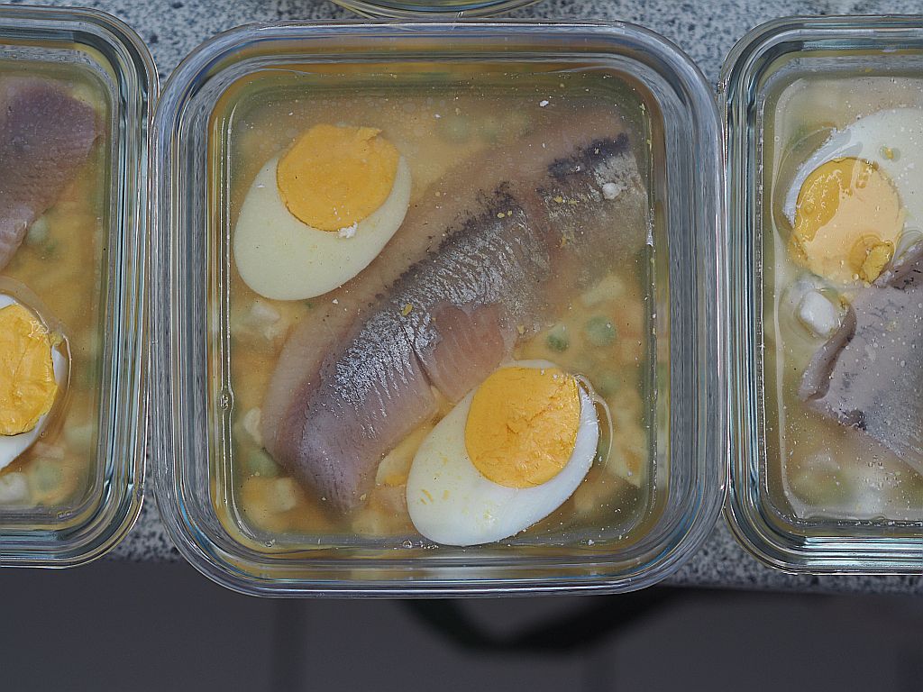 Das Gemüse würfeln. In Salzwasser bißfest kochen. Zum Schluß die TK-Erbsen dazugeben, aber nicht mehr kochen, die sind schon vorgekocht. Abgießen und gut abtropfen lassen. Den Sauerrahm mit der Mayonnaise und Salz vermischen. Die Gemüsewürfel vorsichtig unterheben, die Rinderbrühe aufkochen, vom Herd ziehen und die zuvor eingeweichten und ausgedrückten Gelatineblätter einrühren. Ein bißchen auskühlen lassen. Die Gemüsemayonnaise in die Formen verteilen. Heringe und hart gekochte und halbierte Eier darauf verteilen. Die Rinderbrühe mit Gelatine vorsichtig darüber schütten. Im Kühlschrank zirka 3 Stunden kaltstellen.