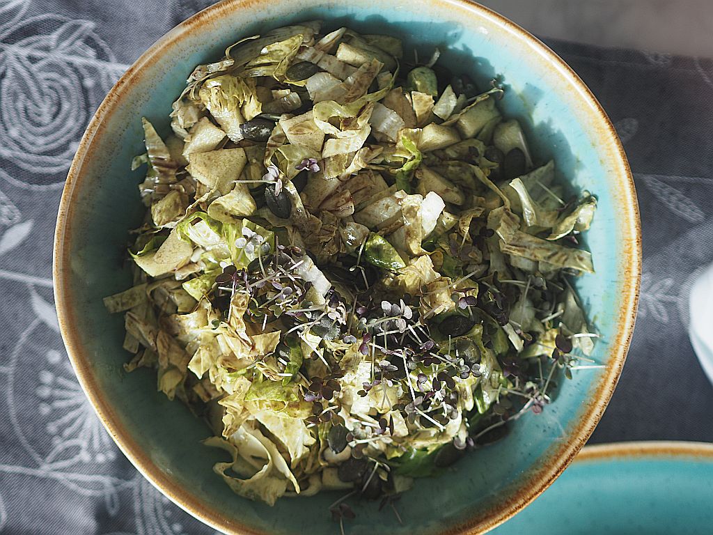 2 grüne Äpfel, Zitronensaft, 30 ml Kürbiskernöl, 1 EL Sherry-Essig, 1 EL Zitronensaft, 1 TL Honig, Salz, 1 Zuckerhutsalat, Kürbiskerne, Radieschensprossen oder andere Micro Greens.
