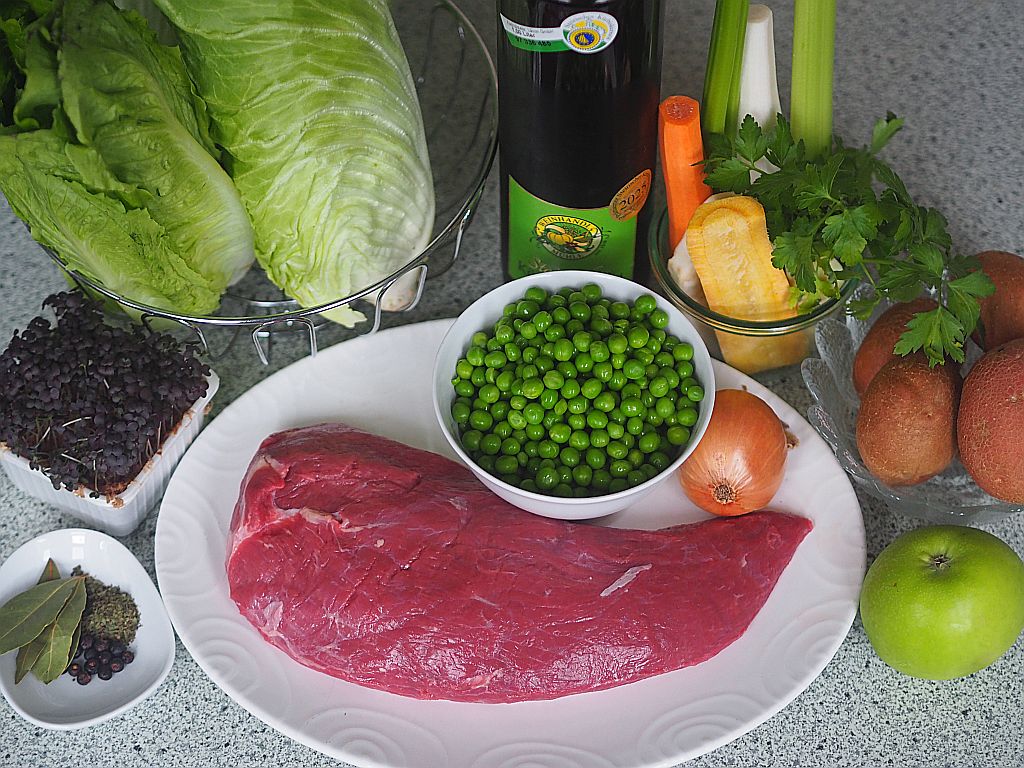 20 g Butter, 20 g Weizenmehl, Rindsuppe vom Rindfleischkochen, 1 Happel Kochsalat, Salzwasser, 100 g aufgetaute TK-Erbsen, Salz, Petersilie