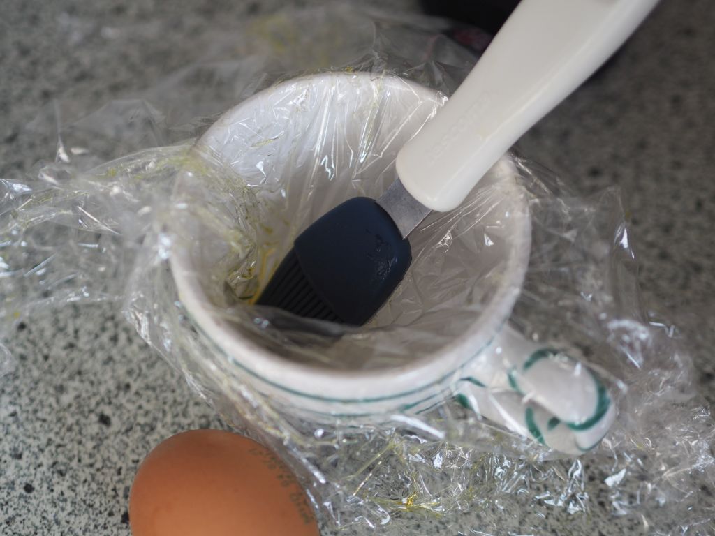 Eine Kaffeetasse mit der Frischhaltefolie mit der bepinselten Seite nach innen auslegen.