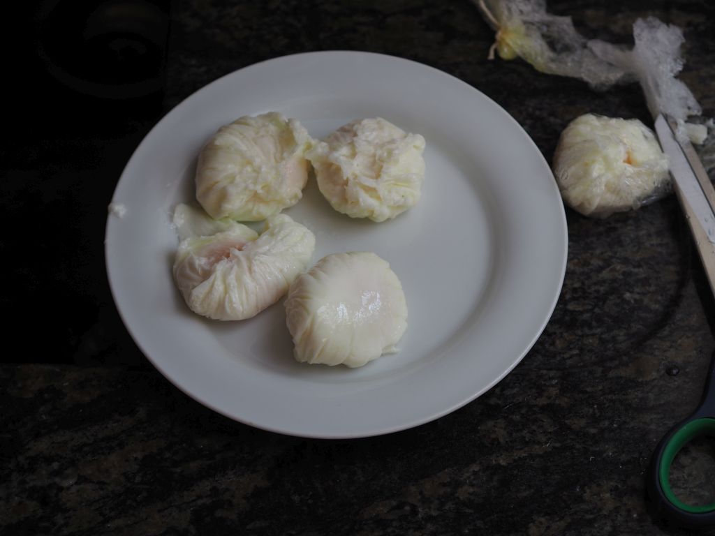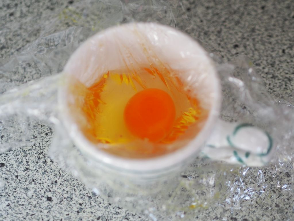 Einen Topf mit Wasser aufsetzen. Ein Stück Frischhaltefolie leicht mit Öl bepinseln. Eine Kaffeetasse mit der Frischhaltefolie mit der bepinselten Seite nach innen auslegen. Ein rohes Ei hineinschlagen. Die Frischhaltefolie so eng anliegend wie möglich mit Küchengarn einen Knoten binden. Das Sackerl ins heiße Wasser legen und zwei Minuten darin köcheln lassen. Dann vom Herd ziehen und beiseitestellen. Fünf Minuten im Topf ziehen lassen. Das Sackerl herausheben. Mit der Küchenschere den Knoten abschneiden. Das pochierte Ei rutscht mit Leichtigkeit heraus, denn die Frischhaltefolie ist ja mit Öl bepinselt.