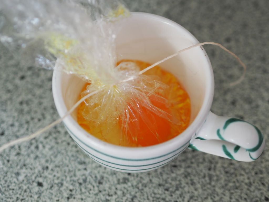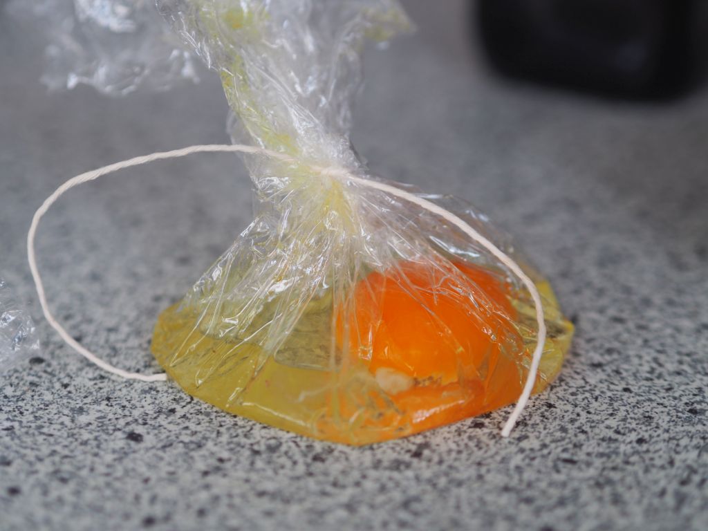 Das verschnürte Ei bevor es ins Wasser kommt.