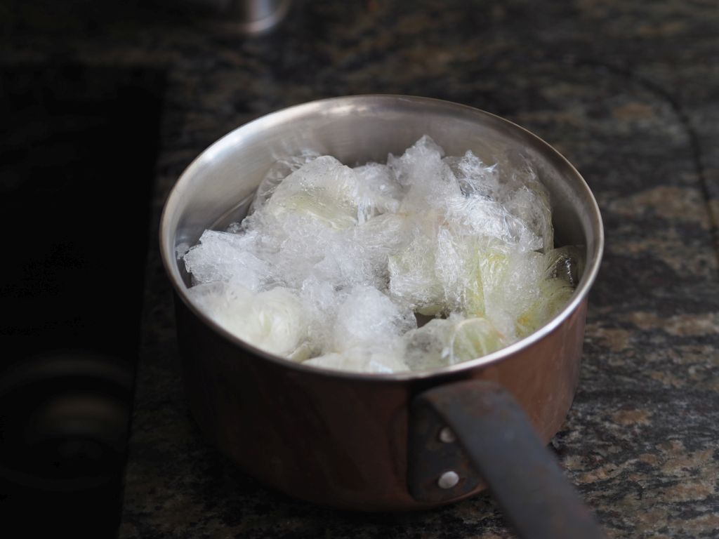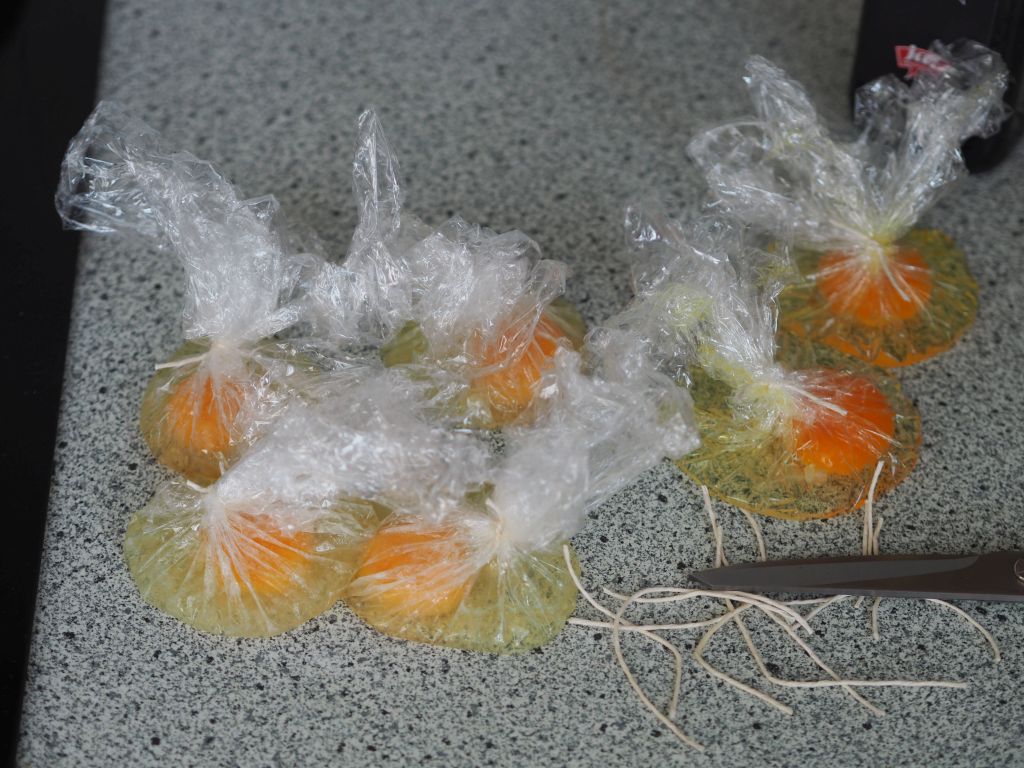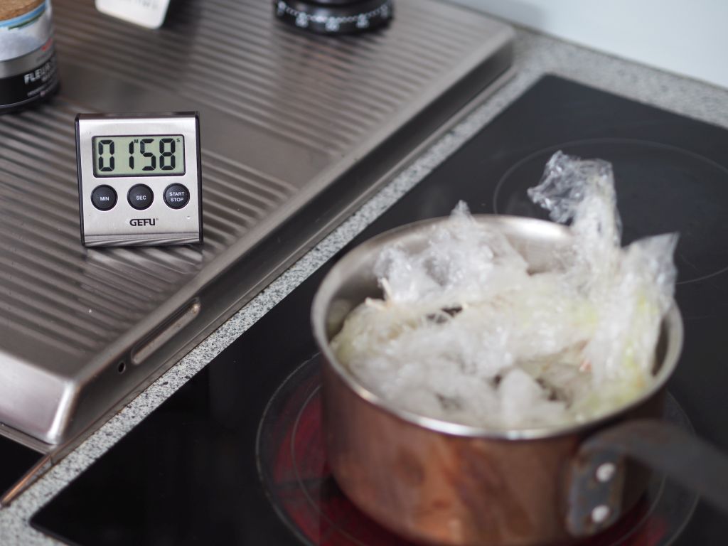 Die Eier im heißen Wasser, man sieht nichts außer Frischhaltefolie.