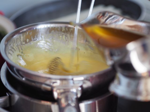 Eine Überhitzung oder ein zu langes Garen der Eigelb würde sie zu kleinen, körnigen Teilchen gerinnen lassen, wobei sie ihre Bindefähigkeit und Geschmeidigkeit verlieren würden. Die erste schwierigste Stufe der Saucenherstellung besteht also darin, die Eigelb vollkommen schaumig zu schlagen und sie dabei einer ständige zunehmenden Hitze auszusetzen, die ein glattes und kremiges Dickwerden der Masse hervorruft.