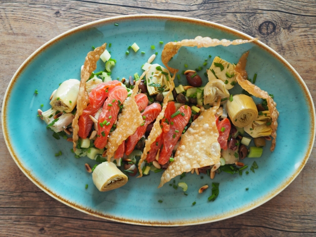 Eins vorweg: so gut haben wir den ganzen Urlaub nicht gegessen. Doch wie soll man ein Gericht mit einer so ausgesuchten Zutat wie Rotlachs (engl. Bezeichnung ist Sockeye) gestalten, diesem Lachs aus Alaska, der nur einmal im Jahr seinen Weg zu uns findet, wenn überhaupt. Bei „Eishken Estate“ gibt es den Wildgefangten seit einigen Wochen, so hört man, doch für nächste Woche schon steht er nicht mehr auf dem Programm.