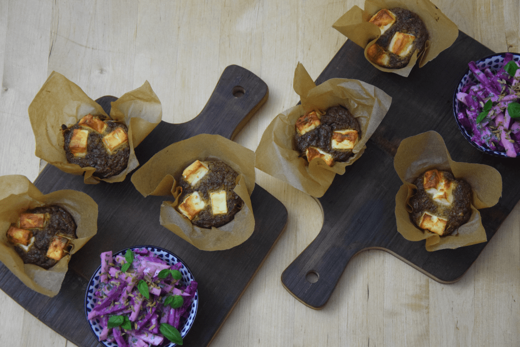 Küchlein aus einem Mais-Teig mit einer Estragon-Mischung befüllen und backen. Dazu gibt es einen Salat mit Roter Bete und Granny-Smith-Äpfel.