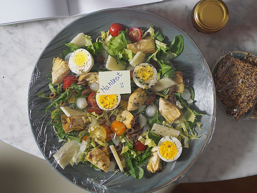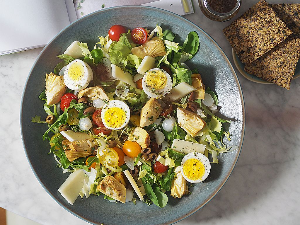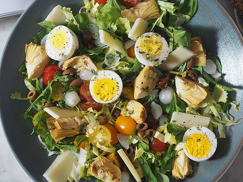Artischocken-Salsa: Artischocken, grüne und schwarze Oliven, gehäutete und entkernte Tomaten, rote Zwiebel würfeln. Mit Salz, Limettensaft und Olivenöl vermischen. Gehackte Petersilie und angeröstete Pinienkerne dazugeben.