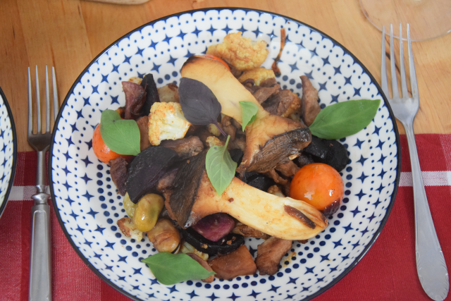 Kohlsprossen mit dem Fleischwolf und dem richtigen Aufsatz in dünne Scheiben schneiden. Die Austernpilze zerpflücken und dann die Pilze und die Kohlsprossen auf ein mit Backpapier ausgelegtes Backblech legen, mit Olivenöl beträufeln, salzen. Bei 180° eine gute Viertelstunde durchgaren bis die Pilz ein bisserl Farbe bekommen. In der Zwischenzeit die Marinade zubereiten: Zitronensaft, Balsamico-Essig, Honig, Salz und Olivenöl vermischen. Petersilie gob hacken. Französischen Ziegenhartkäse in dünne Scheiben schneiden, bzw. die Wachteleier 2 Min. kochen, abschrecken, schälen und halbieren. Aus den restlichen Wachteleiern Spieleier machen. A n r i c h t e n Das Gemüse aus dem Ofen nehmen, noch heiß auf einen Teller geben. mit der Marinade beträufeln. Käse, Spiegeleier und gekochte darauf legen, Petersilie bestreuen. Pfeffer aus der Mühle.