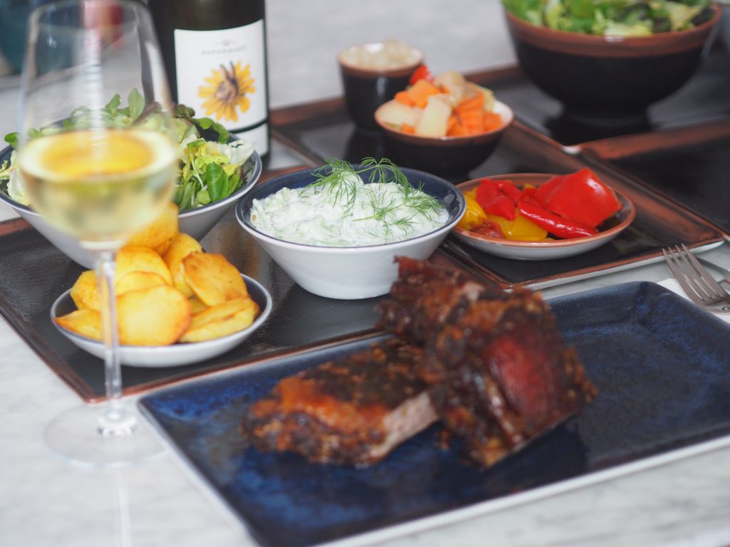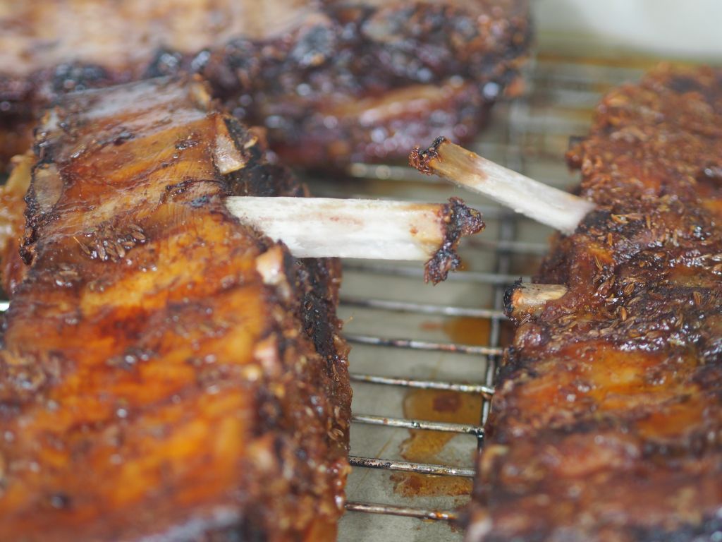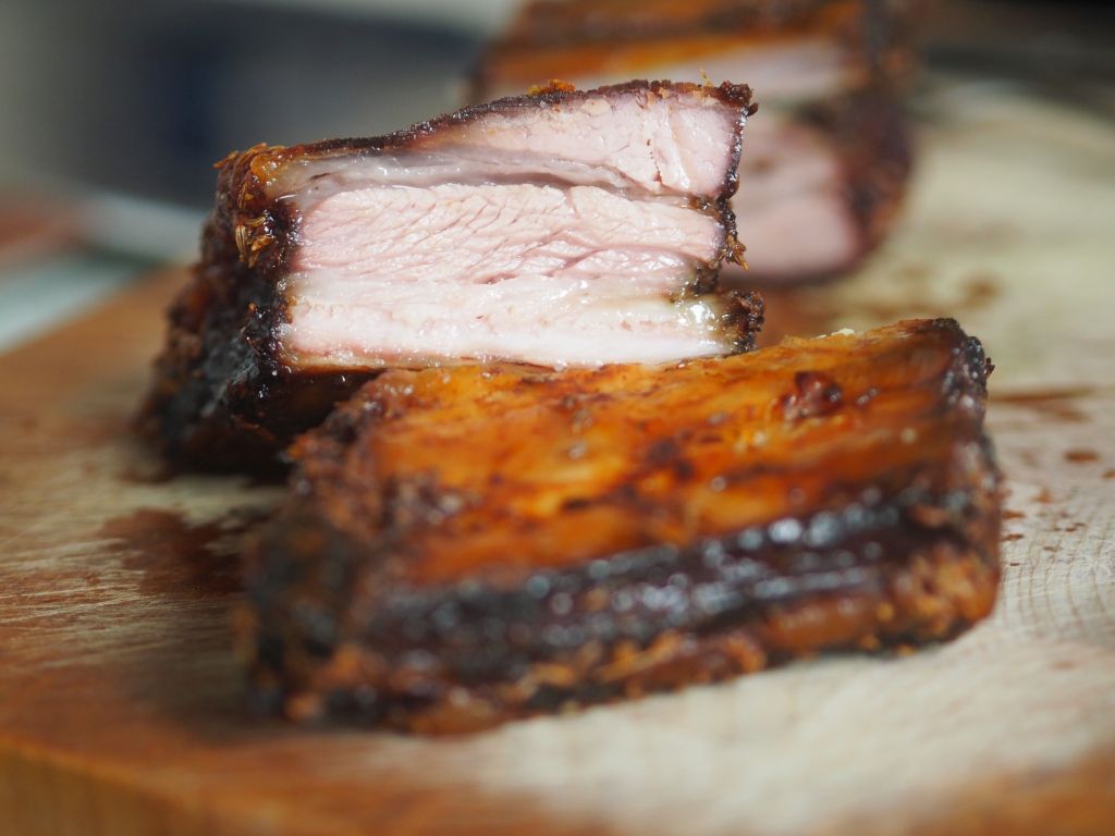 Das Schweinsbrüstl ist von der Partie, dort wo das Schwein genug Fleisch auf den Rippen hat. Wir haben das Schweinsbrüstl mariniert und bei 60° im Backrohr auf einem Backblech 22 Stunden einwirken lassen. Dann wurde das Backrohr auf 80° hochgedreht und das Schweinsbrüstl auf einen Rost umgebettet. Der Test bestand nun darin, zu sehen wie lange es dauert, bis man die Knochen mit den Fingern herausziehen kann und ob auch kein Saft heraustritt: unter dem Rost wurde ein Auffangblech mit Backpapier geschoben, dort würde jeder fallende Tropfen sichtbar werden.