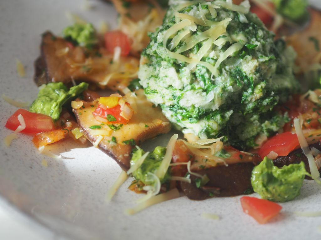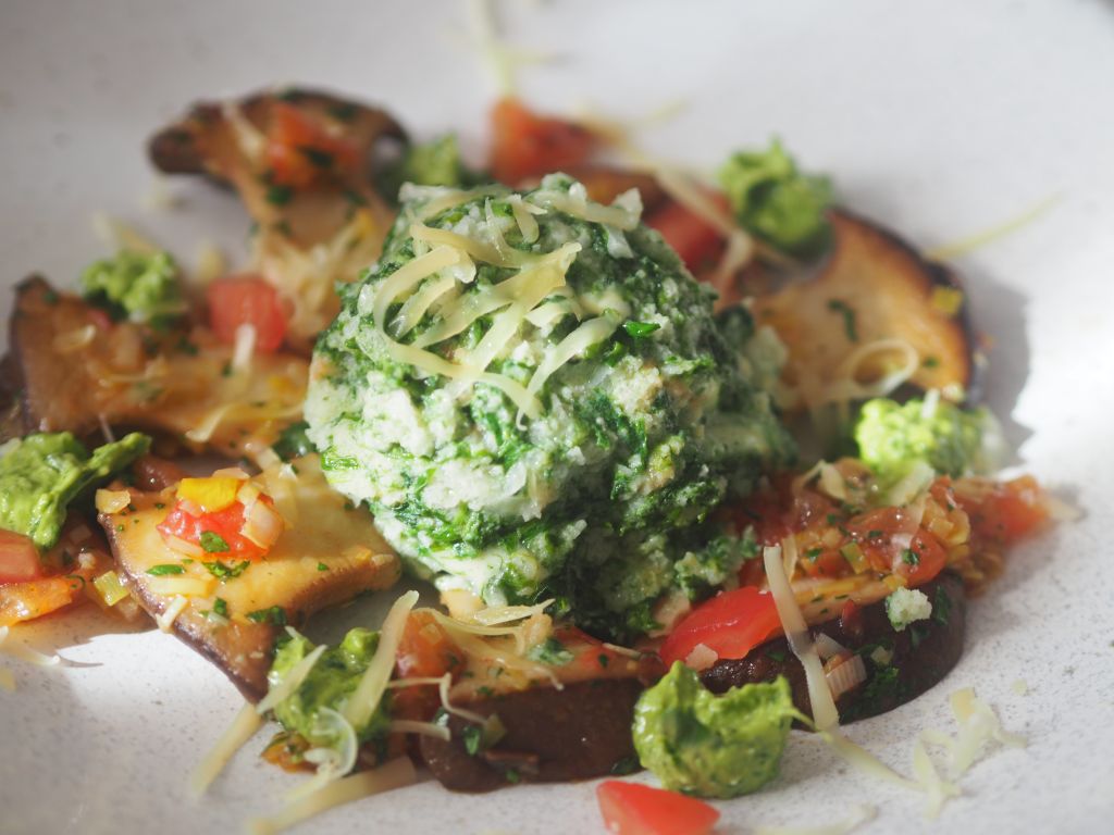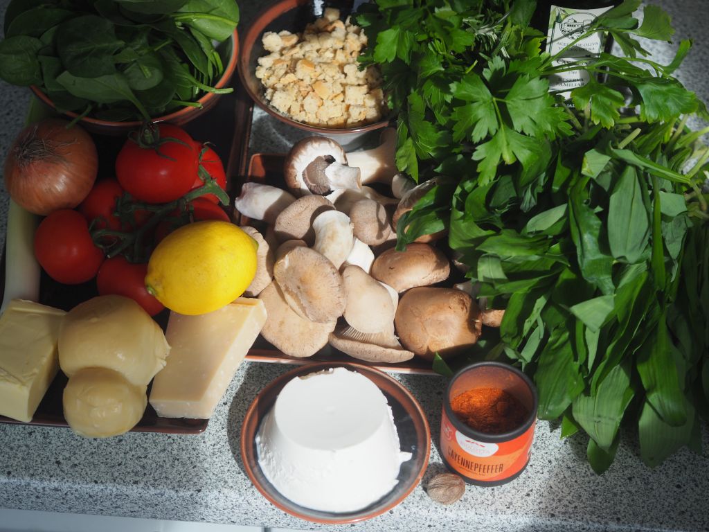 W a l d k n o b l a u c h k n ö d e l Geputzte Waldknoblauch und Spinat in Salzwasser blanchieren, gut auspressen, mit einem Tuch trockentupfen. Grob durchhacken. I n d e r Z w i s c h e n z e i t fein gehackten Zwiebel in Butter hell anschwitzen. Vom Herd nehmen. Grob gehackten Waldknoblauch und Spinat hineingeben, Ricotta hineinrühren. Mit dem Stabmixer ein paar Mal reinfahren und grob pürieren. Sodann zum Knödelbrot, Salz, Pfeffer, Muskatnuß, geriebenen Parmesan und kleingewürfelter Scramorza dazugeben und durchmischen. Zum Schluß die Waldknoblauch-Spinat-Ricotta-Mischung dazugeben und gut durchkneten. Für eine Stunde im Kühlschrank ziehen lassen. I n d e r Z w i s c h e n z e i t die B ä r l a u c h b u t t e r zubereiten: 100 g weiche Butter mit 20 g geriebenen Parmesan, 50 g kleingehackten Waldknoblauch und Salz durchpürieren. Und 30 g Olivenöl beim Pürieren hineinfließen lassen, bis es eine cremige Konsistenz hat. T o m a t e n c o n c a s s è e Tomaten blanchieren. Haut abziehen, Kerne entfernen und würfeln. P i l z e Kräuterseitlinge und Champignon halbieren. Olivenöl in einer Pfanne erwärmen und die Pilze dazugeben. Anschwitzen. I n d e r Z w i s c h e n z e i t den weißen Teil vom Lauch feinhacken. Wenn die Pilze fertig sind, den Lauch und die Tomatenstücke dazugeben. Mit Salz und Zitronensaft abschmecken, zum Schluß mit feingehackter Petersilie bestreuen. K n ö d e l : wenn die Knödelstundevorbei ist, aus dem Kühlschrank nehmen, mit feuchten Händen Knödel formen. In siedendem Wasser etwa 10 Min. ziehen lassen, Achtung: nicht kochen, sonst fallen die Knödel auseinander. Die Knödel herausheben, die Kräuterseitlinge auf dem Teller anrichten. Mit Waldknoblauchbutter beträufeln. Das Knödel in die Mitte legen und mit geriebenen Bergkäse bestreuen.