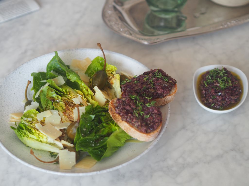 Vor Geschmacksexplosionen kann man sich kaum retten. Der krachende Romanasalat, die riesigen Kapernbeeren, der cremige Parmesan, die Tapenade, bei der man den frischen Knoblauch herausschmeckt, so intensiv ist er, das knusprige Baguette… das alles macht Lust auf mehr. Zum Vergleich haben wir gekaufte Tapenade probiert. Schmeckt nach gar nichts. Wenn man unmittelbar zuvor frisch gemachte Tapenade gegessen hat, gewahrt man den schockierend großen Unterschied. Und es wird einem mit einem Mal bewußt: Fertigware kann gar nichts, sie kann unter keinen Umständen mit frisch Gemachtem mithalten. Und nichts geht über frisches Gemüse, direkt vom Feld, frisch geliefert aus der Gegend. Auch keine Curry-Wurst.