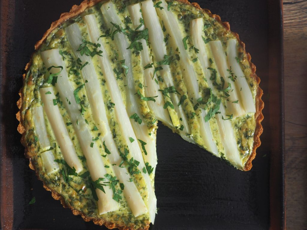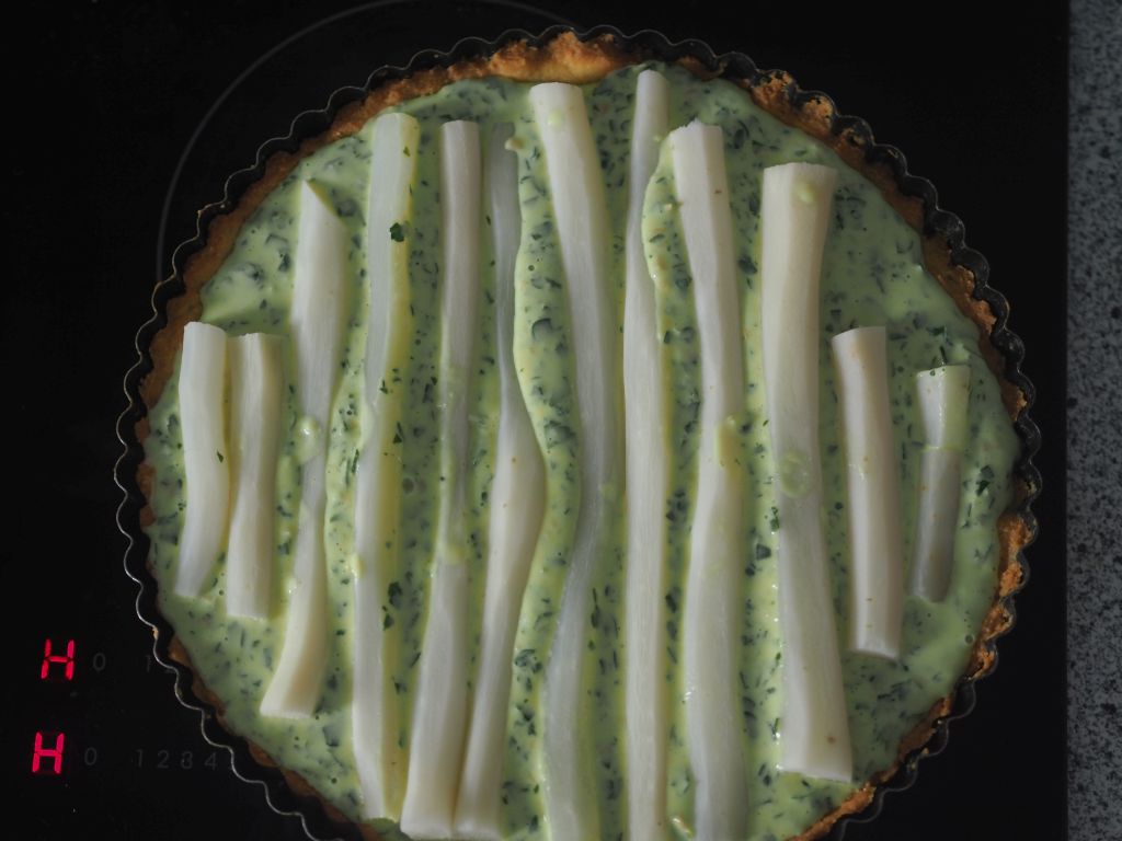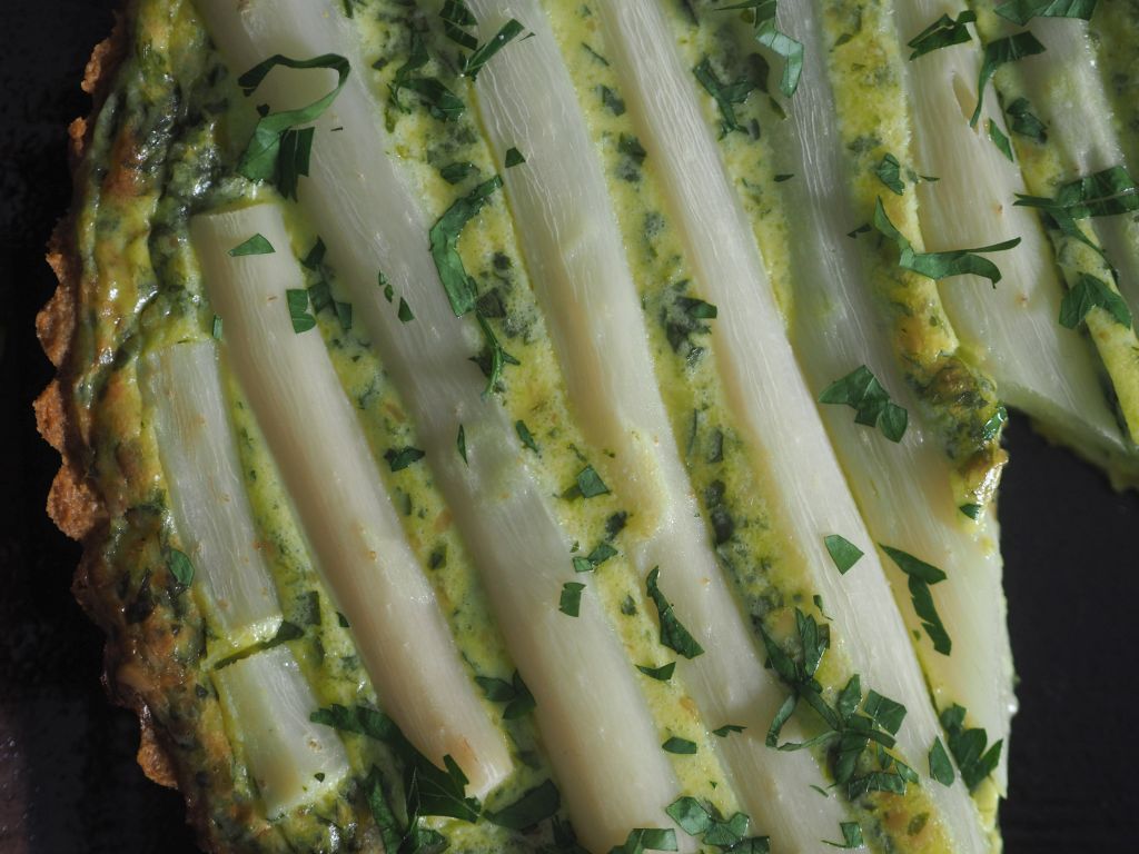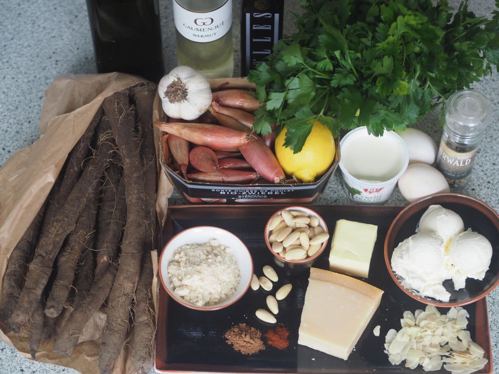 Schwarzwurzeln mit Einweg-Handschuhen schälen und in Essigwasser legen. In Scheiben schneiden, dabei die Schwarzwurzeln nicht länger als nötig aus dem Essigwasser herausnehmen, damit die Schwarzwurzeln an der Luft nicht oxidieren. T e i g Gemahlene Mandeln, Mandelmehl, geriebenen Parmesan, Ei, Butter, Salz, Pfeffer aus der Mühle, alles in eine Schüssel geben, verrühren und zu einem Teig kneten, ausrollen, in Backpapier im Kühlschrank für eine halbe Stunde rasten lassen. G u ß In der Zwischenzeit ein Petersilienpesto machen, dann die Crème fraîche, Ei, das Petersilienpesto, Salz und Pfeffer mit dem Schneebesen verrühren. Die Schwarzwurzeln in Wasser mit reichlich Salz vorkochen. B a c k e n Eine Form mit Backpapier auslegen und den Teig einlegen. Im Backrohr bei 200° Ober/Unterhitze eine Viertelstunde vorbacken. Dann den Guß hineingeben und die Schwarzwurzeln darauf schlichten. Eine Viertelstunde backen, bis der Guß fest und goldbraun ist. A n r i c h t e n Mit Petersilie bestreuen und servieren.