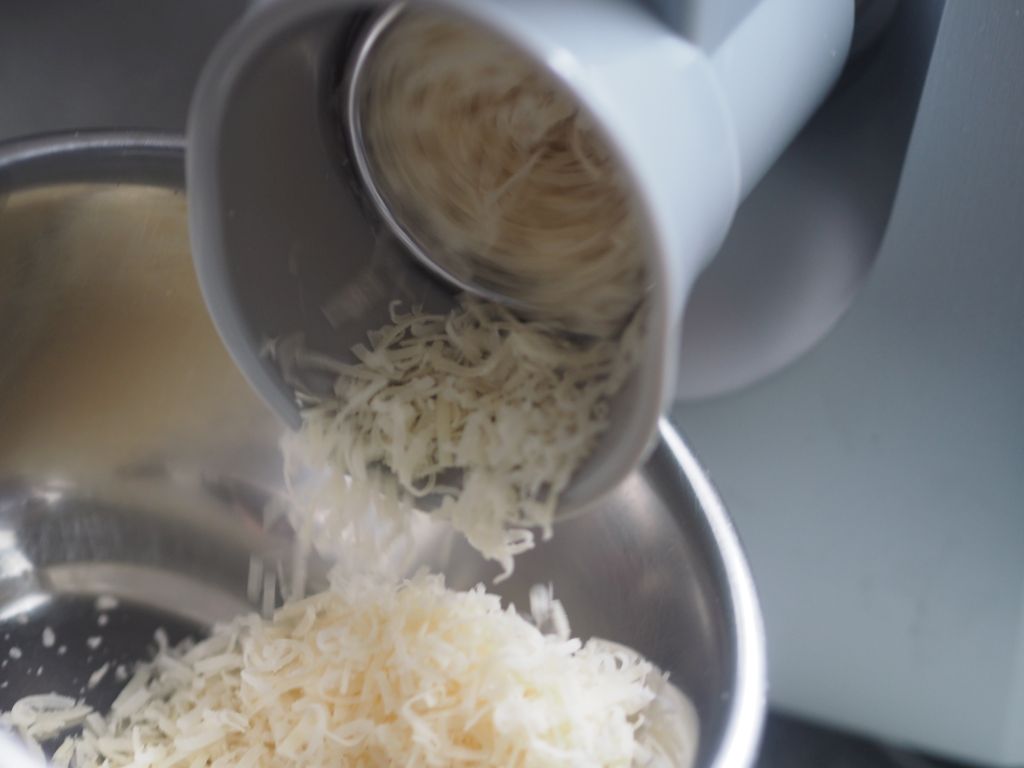 Zu einem Schlager hat sich der neue Bosch-Fleischwolf entwickelt. Mit dem entsprechenden Aufsatz reibt die Hofköchin den Parmesan. Es geht schnell und es ist auch schnell wieder weggeräumt: sofort nach Verwendung den Aufsatz mit heißem Wasser ausspülen, trocknen und wegräumen. Wird verwendet anstelle der Zauberrette. Die Zauberrette hat dadurch ihren Sinn nicht verloren: mit ihr wird das Pesto gemacht.