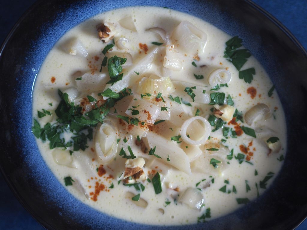 Schwarzwurzeln mit Einweg-Handschuhen schälen und in Essigwasser legen. In Scheiben schneiden, dabei die Schwarzwurzeln nicht länger als nötig aus dem Essigwasser herausnehmen, damit die Schwarzwurzeln an der Luft nicht oxidieren. Butter in einer Sauteuse aufschäumen, in 1cm dicke Scheiben geschnittene Schalotten darin anschwitzen, die Schwarzwurzeln dazu geben und 3 Min. darin braten, bis die Butter braun wird. Mit Wermut und der nebenbei aus Gemüseabfall entstandenen Gemüsebrühe ablöschen, aufkochen und zugedeckt 10 Min. köcheln lassen, bis die Schwarzwurzeln durch sind. In der Zwischenzeit den Petersil hacken. Dann das Gemüse abseihen, beiseite geben und den Sud noch einmal aufkochen. Frischkäse einrühren. Mit geriebener Muskatnuß, dem Abrieb einer Zitrone, Cayennepfeffer, weißem Pfeffer aus der Mühle und Salz würzen. A n r i c h t e n Das Gemüse in die Sauteuse zurückgeben. Mit einem Schöpflöffel auf den Tellern verteilen. Verhackte Walnüsse dazugeben. Mit Petersilie bestreuen. Dazu eine Schnitte Roggenbrot.