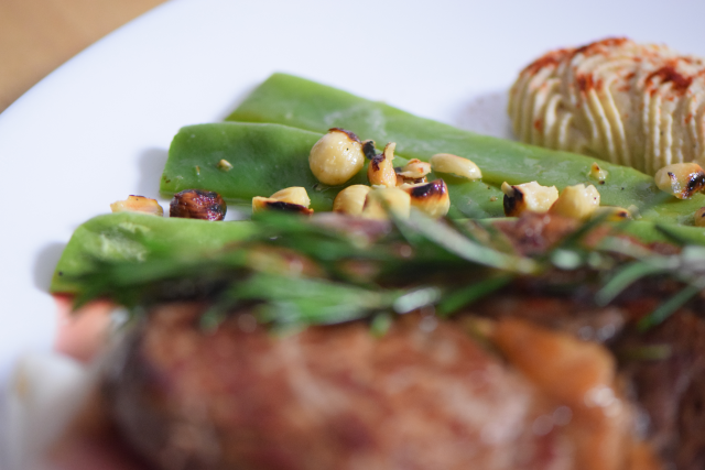 Das Wagyu-Steak 2 Minuten auf allen Seiten braten. Über die Bohnen ein bisschen Parmesan reiben.