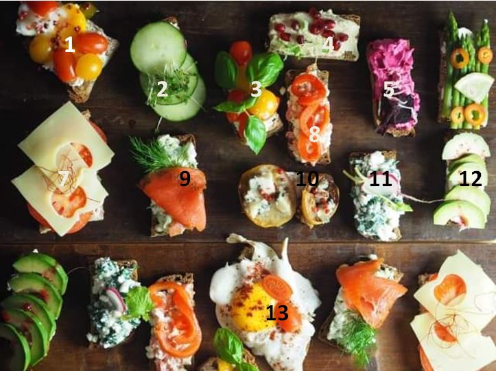 Statt Tomaten sollten Ribisel sein, diese hätte es gegeben, haben wir aber verweigert, kamen aus Holland, sehr teuer. Statt Blattsalatherzen aus Spanien, nahmen wir Wildkräuter aus dem Glashaus. Ziegenbutter statt „normaler“ Butter, englischer Senf, Cottage Cheese, Roastbeef, Avocado waren ziemlich hart, Tomaten, Kresse, rote Senfsprossen, Wildkräutersalat mit Pimpinelle, Schafgarbe und Sauerampfer.