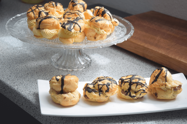 Brandteigkrapferl mit Vanille- und Schokocreme
