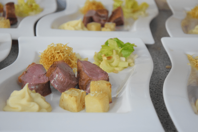 Zwiebelsuppe mit Kartoffelespuma, Wachtelei und Trüffel. Gebratene Entenbrust mit Selleriepüree, konfierten Sellerie (Selleriewürfel) und Sellerienester (gebratene dünne Selleriestifte). Alles lässt sich gut vorbereiten. Für die Suppe muss am Feiertag (Ostersonntag) der Espuma aufgeschäumt werden. Für die Hauptspeise haben wir die Entenbrust gebraten und die Sellerie frisch frittiert und dazu Stangenselleriesalat gemacht.