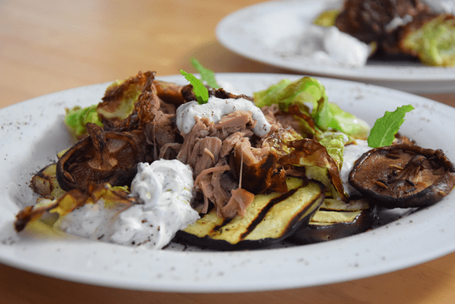 Gebackene Miso-Aubergine mit Schafkäse und Tahini-Kefir