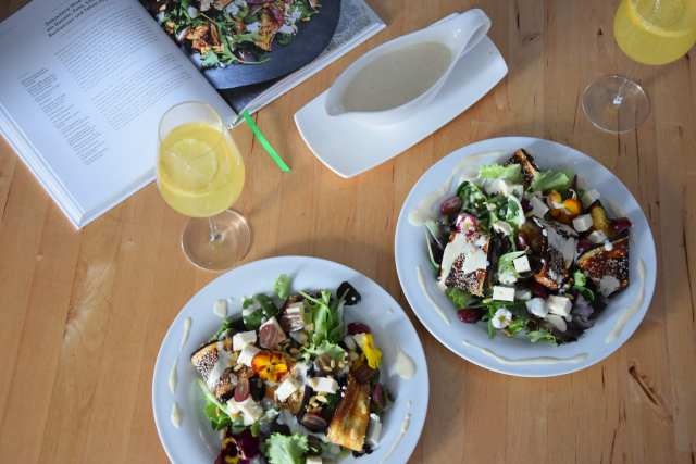 Gebackene Auberginen, zuvor mit einer Miso-Mischung bestrichen mit einem Dressing von cremiger Konsistenz aus Kefir und Tahini. Das sowie Saft und Schale von Orangen und man hat einen wunderbaren Salat.