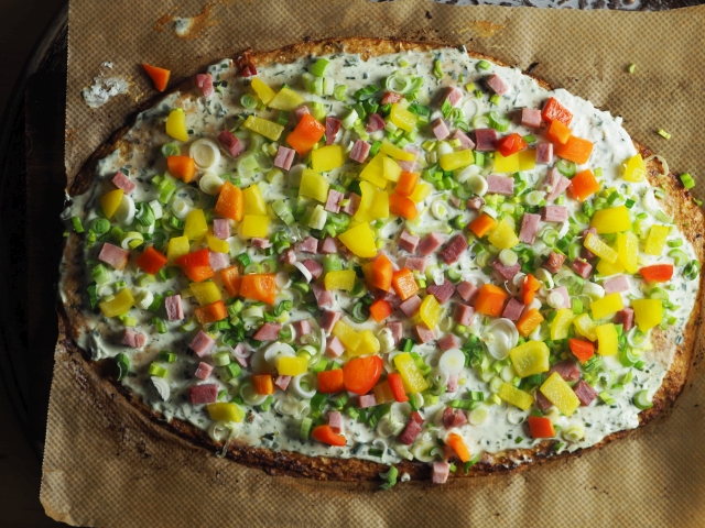 Den Karfiol in der Zauberette zerkleinern und auf ein mit Backpapier ausgelegten Backblech auslegen. Bei 180 °C etwa 10 Minuten backen. Auskühlen lassen. Karfiol mit feingehacktem Knoblauch, Ei, geriebenem Cheddar-Käse, Salz, Pfeffer, getrocknetem Oregano, Thymian und Rosmarin vermischen. Die Karfiolmasse auf dem Backblech etwa 1 cm dick ausstreichen und zirka 15 Minuten vorbacken. In der Zwischenzeit Frischkäse mit feingehacktem Petersilie, Salz und Pfeffer verrühren. Den Flammkuchenteig mit Frischkäse bestreichen, mit in dünne Ringe geschnittenem Jungzwiebel, gewürfelten Paprika und gewürfeltem Schinken bestreuen, weitere 15 Minuten backen.