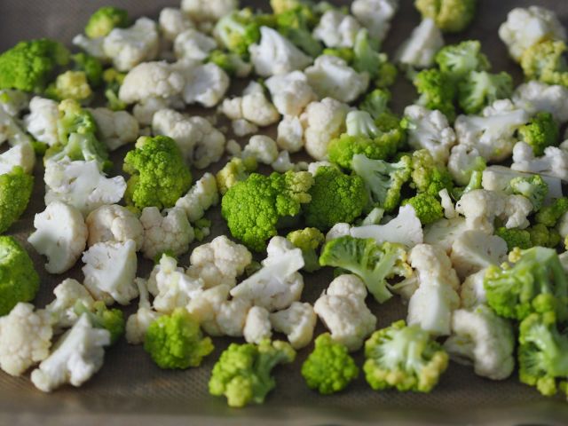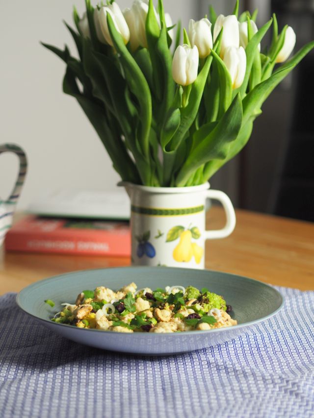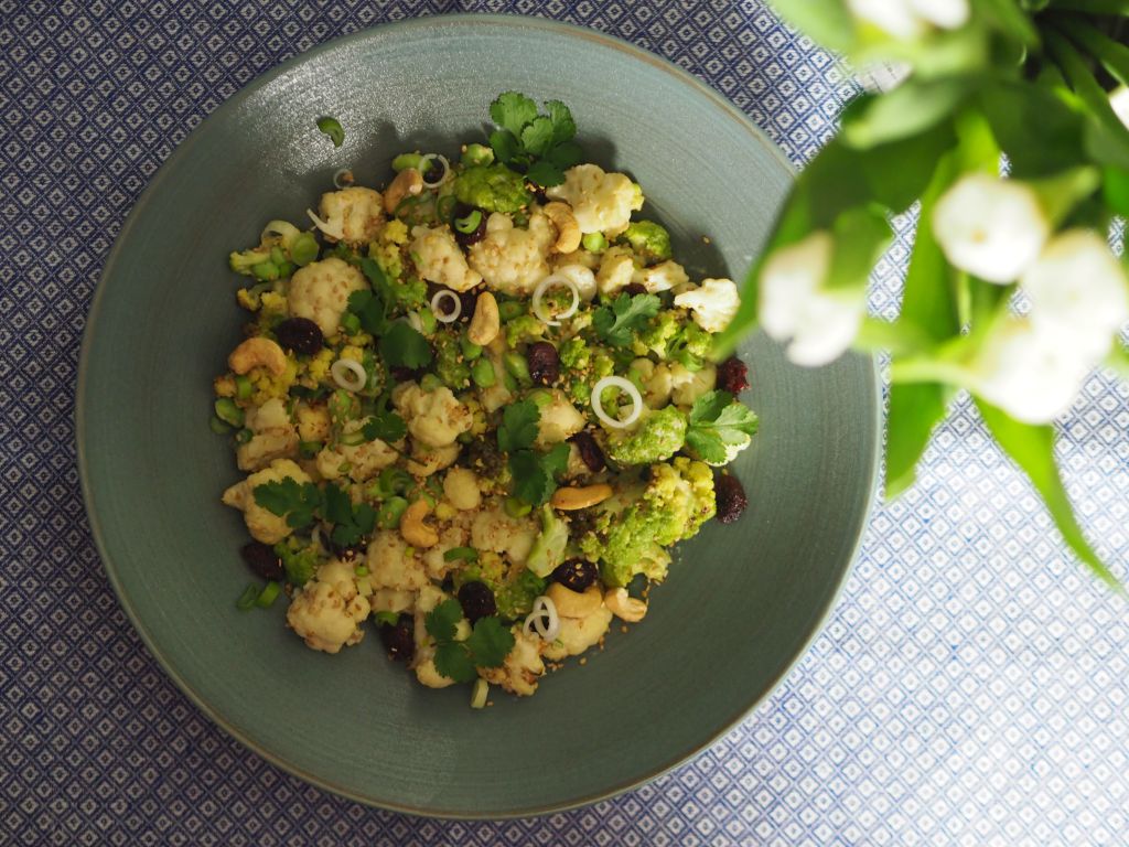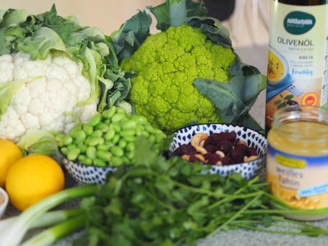 Einen kleinen grünen und einen kleinen weißen Karfiol in Röschen teilen, mit Olivenöl und Salz mischen und auf ein mit Backpapier belegtes Backblech legen und im Backrohr bei 190 Grad 30 Minuten rösten. In der Zwischenzeit drei Frühlingszwiebel in dünne Scheiben schneiden, 150 Gramm Sojabohnen blanchieren und enthäuten. Den Karfiol aus dem Backrohr nehmen und in eine Schale geben, mit den Frühlingszwiebel, Sojabohnen, getrocknete Cranberries, Cashewkerne, gehackten Koriander und zwei Esslöffel geröstetem Sesam vermischen. Dressing: 80 Gramm Tahini mit 120 Milliliter Wasser den Abrieb und den Saft einer Zitrone und Salz gut verrühren. Den Salat damit marinieren.