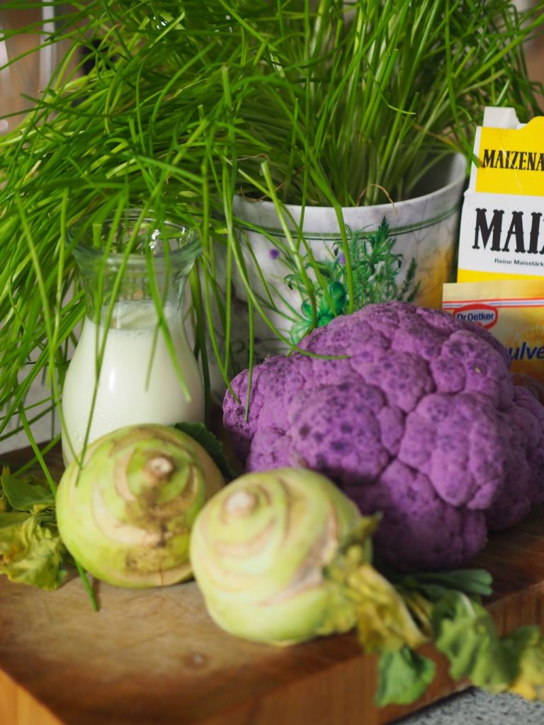 Tempura-Teig 40 Gramm Mehl, 40 Gramm Maisstärke, 100 Milliliter Wasser, ein Eßlöffel Rapsöl, Salz, Muskatnuß und geriebene Schale einer Zitrone zusammenmischen und im Kühlschrank fünf Minuten ziehen lassen. Karfiol In der Zwischenzeit Karfiolröschen aufteilen und in kochendem Salzwasser zwei Minuten bißfest kochen. Abgießen und gut abtropfen lassen. Anschließend im Tempurateig weden und in heißem Rapsöl aussebacken. Kohlrabi schälen, vierteln, in Scheiben schneiden. Die schönen grünen Kohlrabiblätter auf die Seite legen. Dann die Kohlrabi sechs Minuten in kochendem Salzwasser bißfest kochen und abgießen. Bis der Kohlrabi kocht, 200 Milliliter Sahne in der Kasserolle mit Salz, Pfeffer und Muskatnuß abschmecken und einköcheln. Kohlrabi und die Kohlrabiblätter dazu geben. Noch ein paar Minuten auf kleiner Hitze köcheln. Zum Schluß mit reichlich Schnittlauch bestreuen.