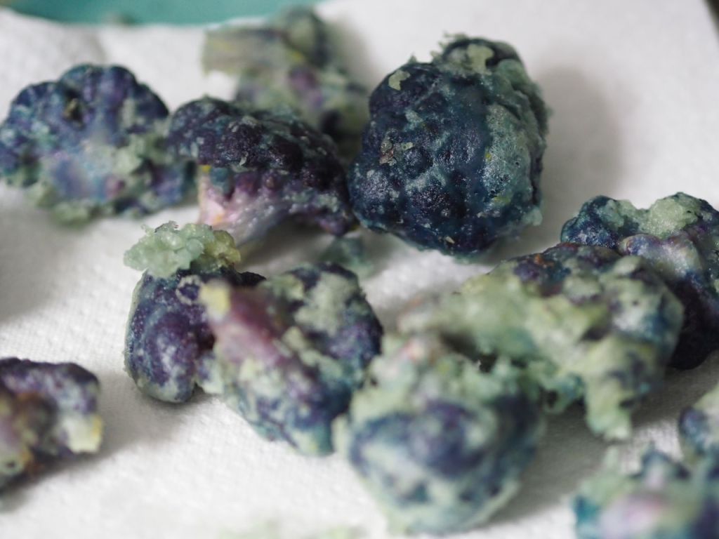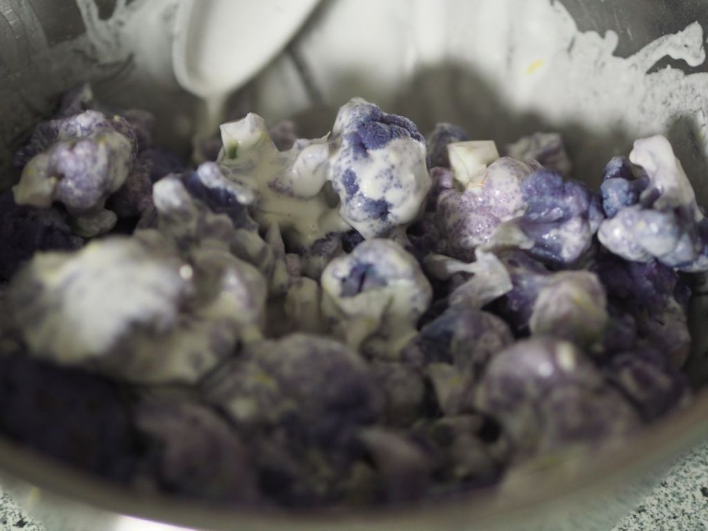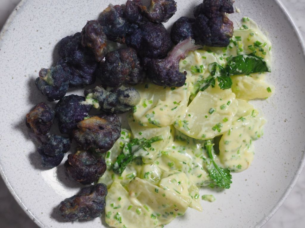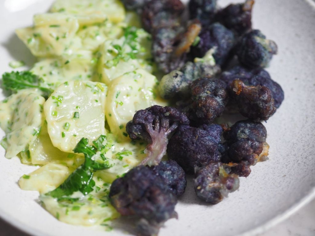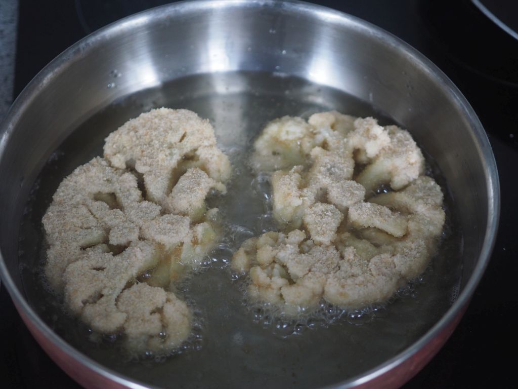 Das sind panierte Scheiben nur halt nicht vom Kalbsfrikandeau oder aus der Oberschale vom Schwein sondern vom Karfiol. Man sollte den Karfiol nicht so vorgaren, daß er beim Schneiden in Scheiben zerfällt, das geht sehr schnell. Gebackener Karfiol – das ist eigentlich was Uraltes. Aber hier wird es ein bisserl anders zubereitet: normalerweise wird der Karfiol in Röschen geteilt und paniert in Mehl, Eier und Bröseln. Hier wird aber Dinkelmehl mit Stärke und eiskaltem Wasser verrührt, so ähnlich wie bei einem Tempurateig.