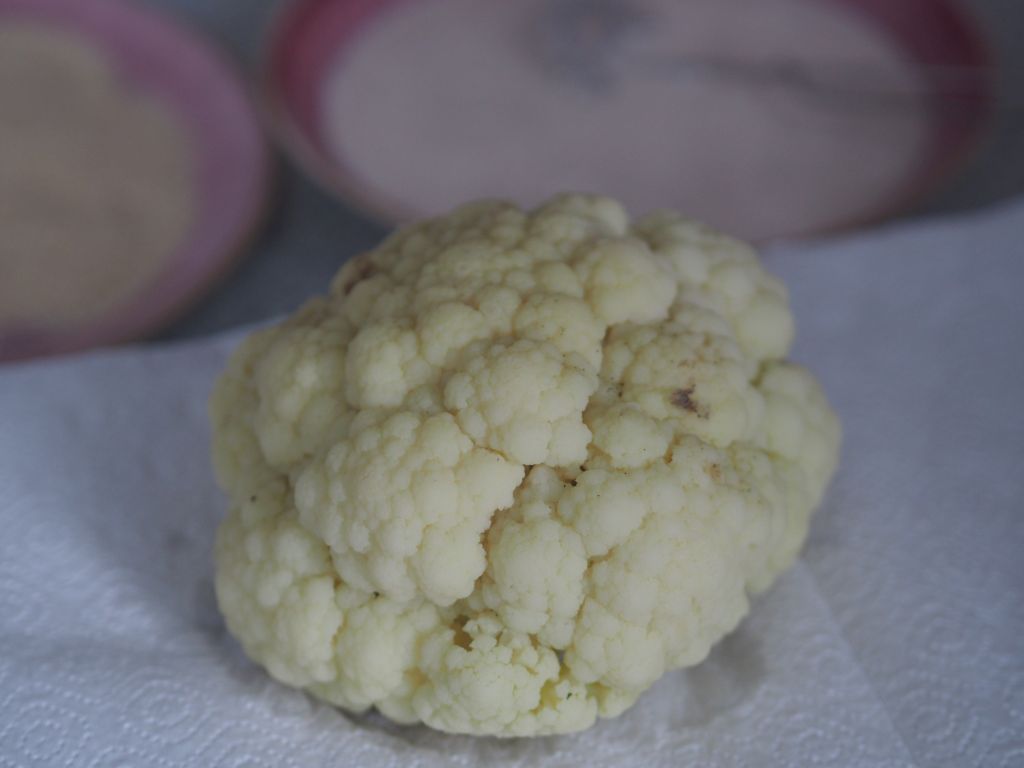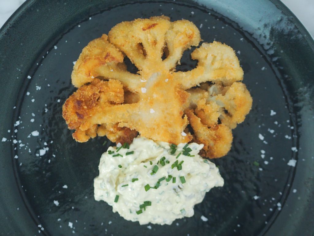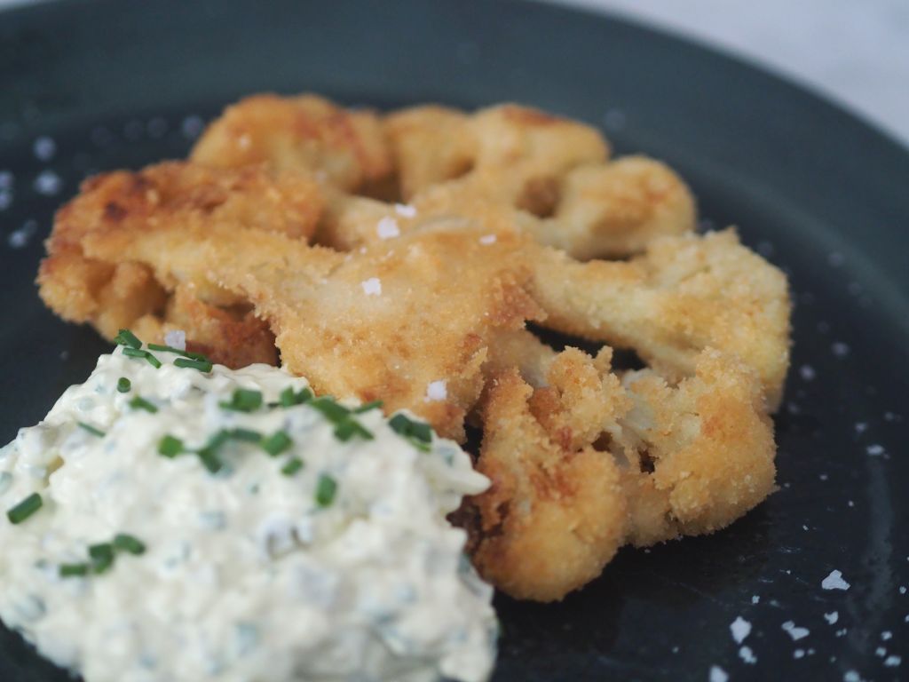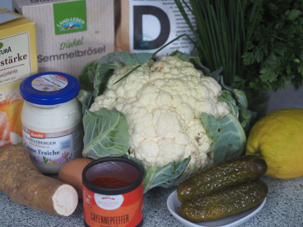 Der Karfiol wird im Ganzen in einer Gemüsebrühe gegart, nach dem Trocknen und Abtupfen wird er in Scheiben geschnitten. Dann wird das Dinkelmehl mit Stärke mit eiskaltem Wasser verrührt; durch den die Karfiolscheiben gezogen werden. Herausheben und durch die Bröseln ziehen, dann ganz normal in heißem Öl herausbacken. Dazu eine Remoulade machen: mit Quick-Mayonnaise, Crème fraîche, frisch geriebenem Kren und gewürfelten Essiggurkerln, Salz, Zitronensaft, Cayennepfeffer und Schnittlauch.