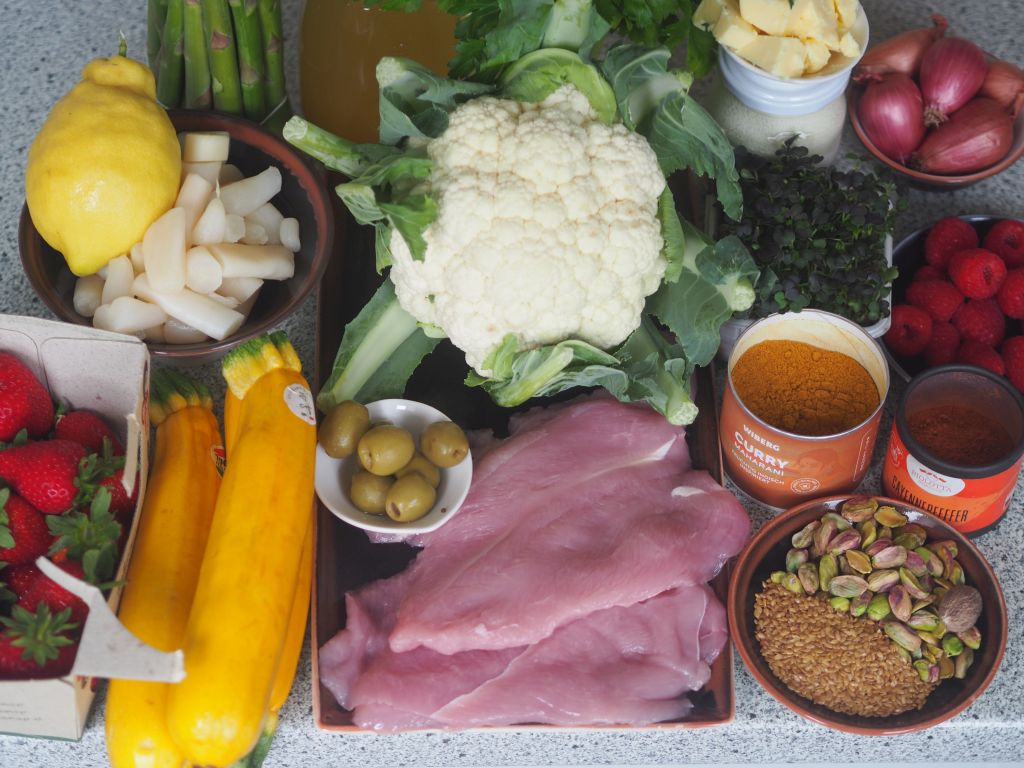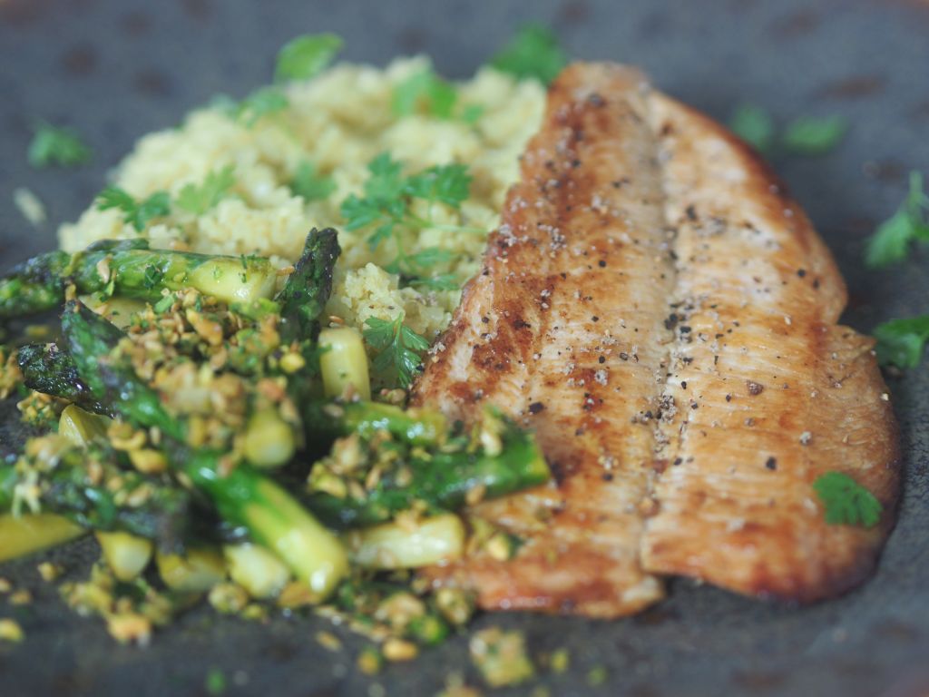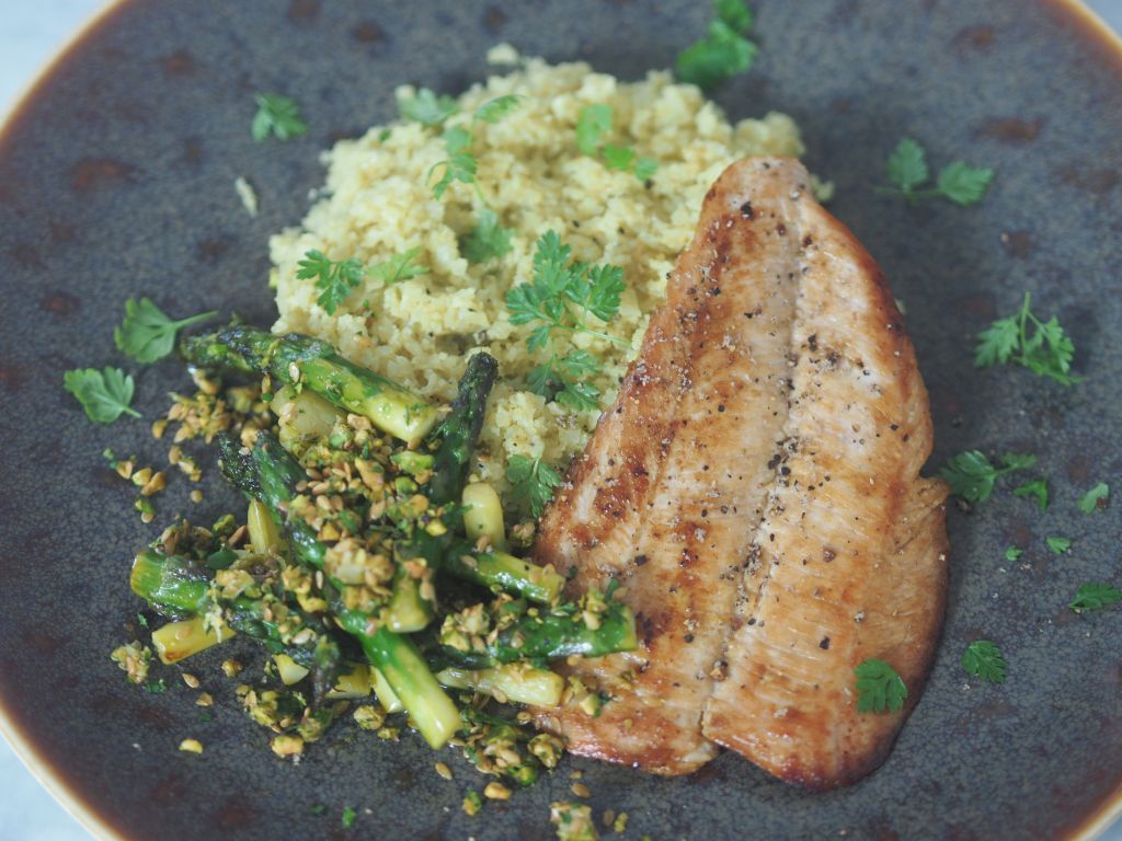 Als Hauptspeise gab es eine Zusammenstellung aus 2 Rezepten von Bettina M: einmal Pute mit Karfiolreis. Für den Salat nahm die Küchenfee Anleihen bei einem anderen Rezept: Garnelen mit Spargel und Oliven-Pistazien-Topping mit Leinsamen und Petersilie nur ohne Garnelen.