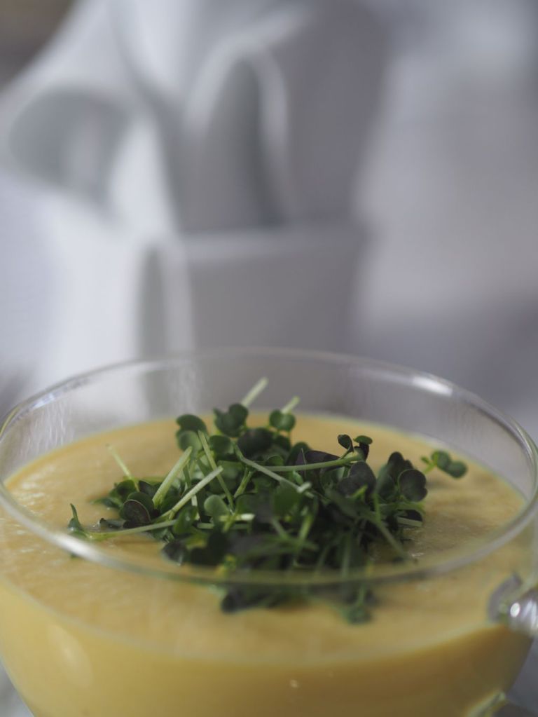 Die Schwarzwurzel im Glas erspart den mühsamen Arbeitsvorgang, sie mit Handschuhen, unter laufendem Wasser zu reinigen und zu schälen. Schalotten werden in Kokosöl glasig gedünstet, dann kommen nach der Reihe gelbe Zucchini und Schwarzwurzeln rein. Gewürzt wird mit etwas Currypulver. Abgelöscht mit Gemüsesuppe, einmal aufgekocht und ein bisserl köcheln gelassen. Danach verrührt man es mit Schlagobers, püriert es und würzt mit allerlei Gewürzen wie Cayennepfeffer, Zitronensaft,…. Aber nicht zu viel, um das Erdige der Schwarzwurzeln nicht zu übertünchen. Mit Pakchoi Microgreens bestreuen.
