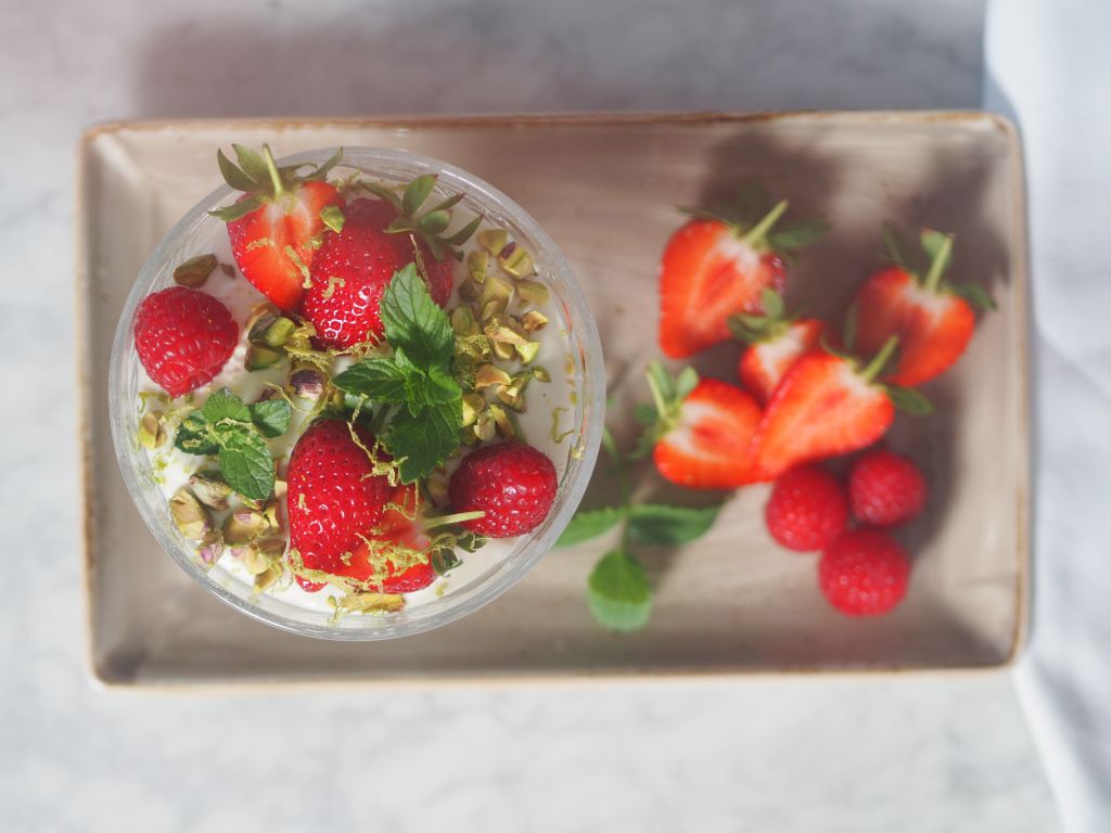 Als Nachspeise gab es eine Topfencreme mit Mandelmus, Vanille und Himbeeren und Erdbeeren.