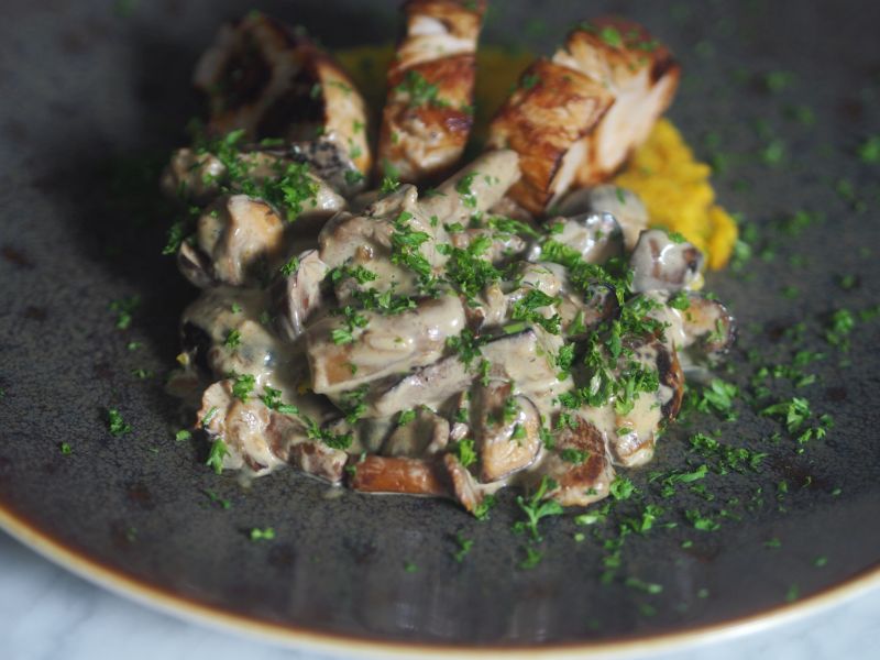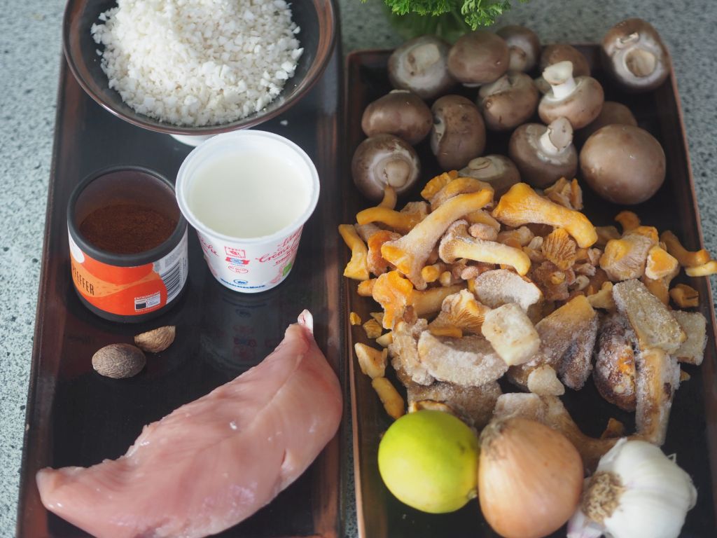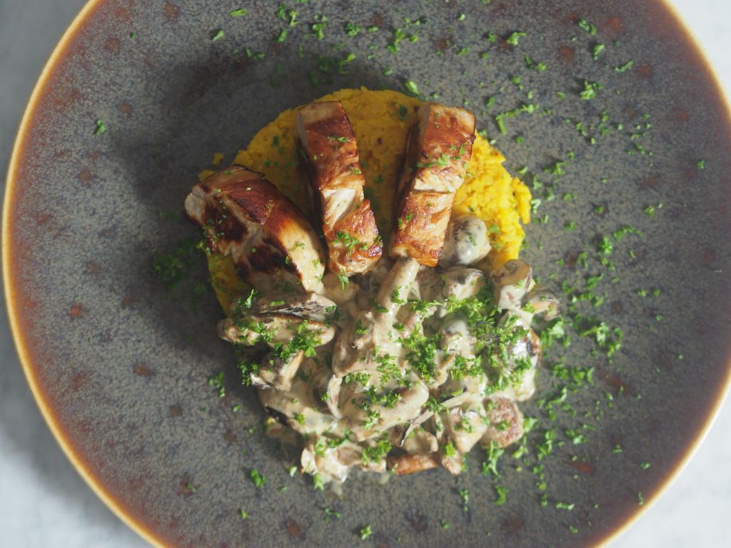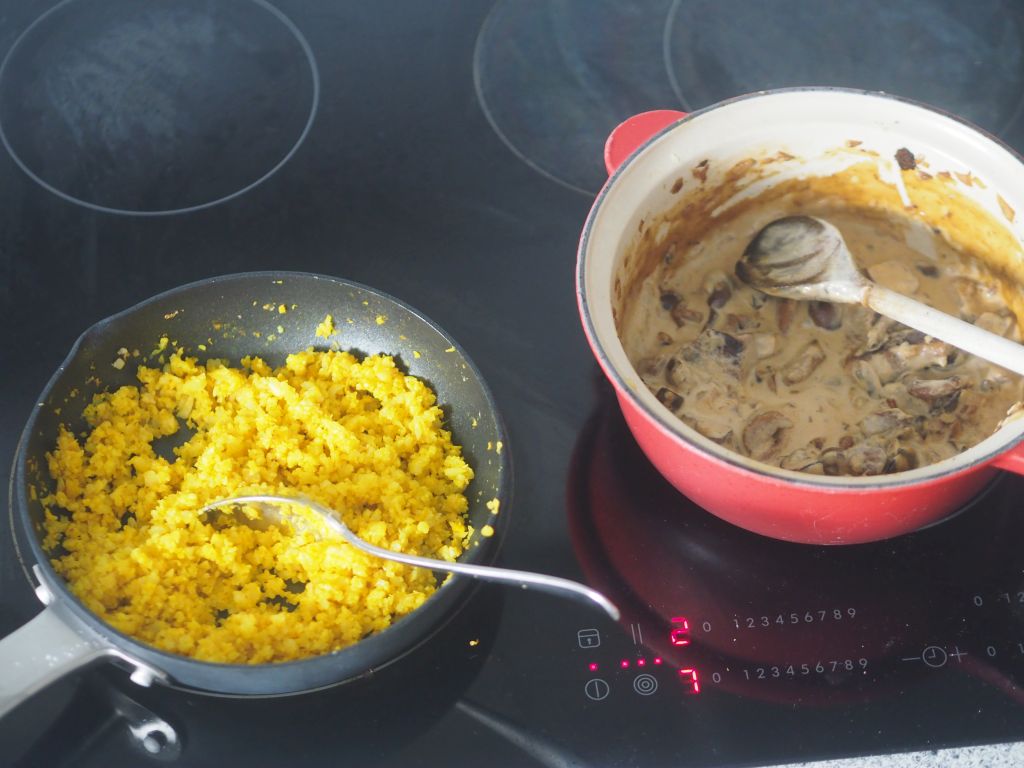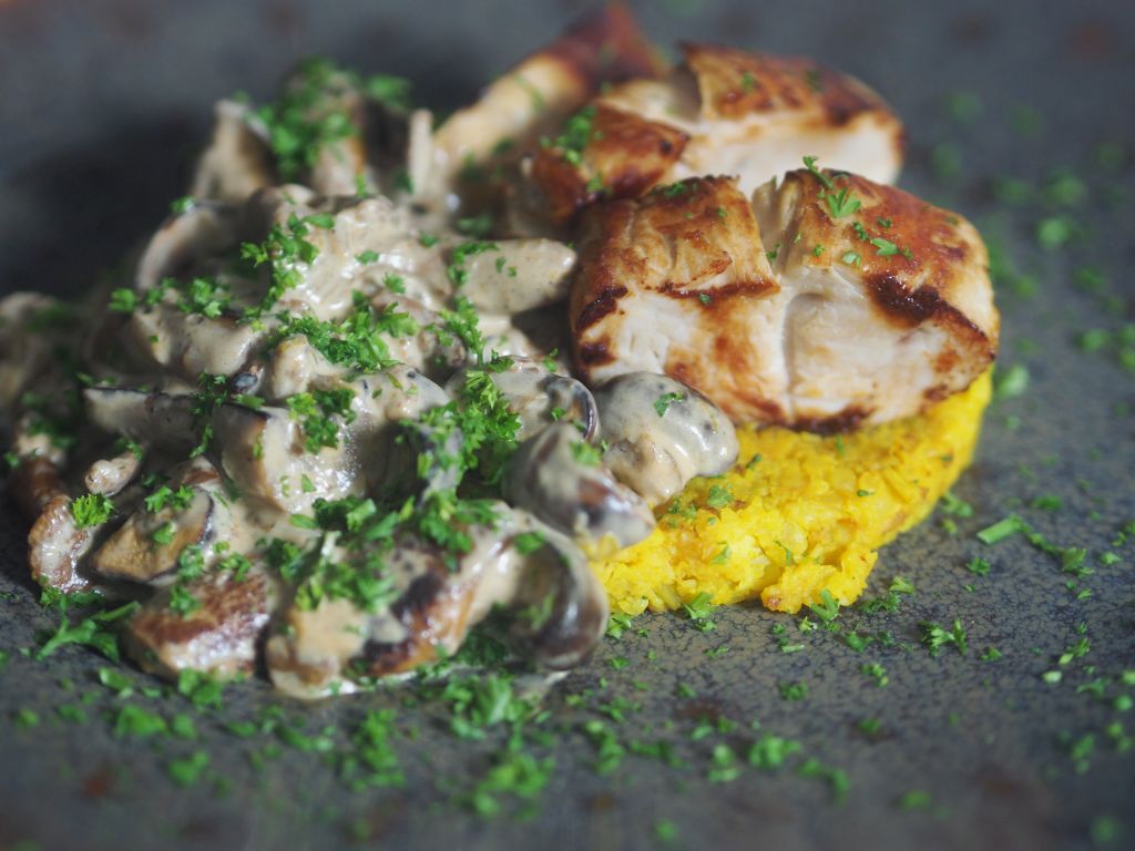 K a r f i o l r e i s Den Karfiol in der Zauberette zerkleinern. In einer Pfanne Olivenöl erwärmen, Karfiol hineingeben, salzen. Auf mittlerer Hitze ein bissi braten, bis der Karfiol durch ist. Kurkuma einrühren. Ein paar Spritzer Limettensaft dazugeben und abschmecken. P u t e n f i l e t Das Filet in der Pfanne beidseitig anbraten. Bei 160° auf dem Rost im Backrohr durchgaren. P i l z s o ß e Eierschwammerl, Steinpilze und Champignons ohne Öl in der Pfanne braten. Zum Schluß ein bißerl salzen. In einem Topf fein gehackten Zwiebel in Olivenöl anschwitzen. Wenn die Pilze angebraten sind, zu den Zwiebeln geben. Die Pilzpfanne mit Pernod ablöschen und die Flüssigkeit zum Topf gießen. Crème fraîche hineinrühren, mit Salz, Limettensaft und geriebener -schale, sowie Cayennepfeffer abschmecken. 10 Min. simmern lassen. Anrichten.