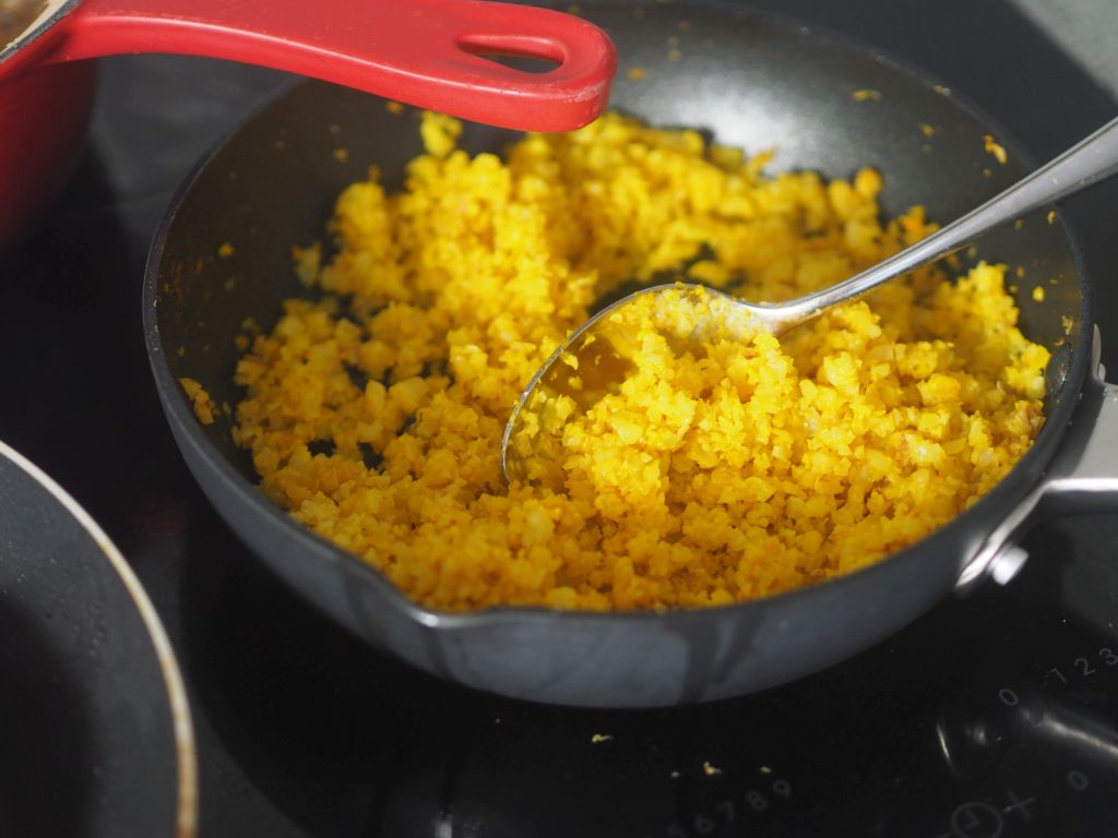 Bei Bettina Matthaei heißen die Karfiolbrösel Blumenkohl-„Polenta“. Aber ich kenne keine Gnade, das einzuösterreichern. Dieses Gericht ist wie das letzte Mal mit Tofu, aber nun wird der gerissene Tofu gebraten und zwar unter Rühren, Bettina M schreibt „rührbraten“; – ein Ausdruck, den ich noch nicht gehört habe, gefällt mir. Der Tofu wird in der Pfanne mit einer selbstgemachten Erdnußbutter aus Sambal Oelek – das ist nichts anderes als Chilisoße, haben wir von Stekovics – Tamari, etc. angemacht. Der Karfiol wird im Blitzhacker zerkleinert und ebenso rührgebraten. Dazu kommen gebratene Tomaten, gewürzt wird mit Schwarzkümmel, Kurkuma und ein wenig Salz. Der Karfiol mit dem Schwarzkümmel hat einen neuartigen Geschmack, alles schmeckt irgendwie anders, aber es schmeichelt dem Gaumen wunderbar. Wir streuen noch ein bißchen Micro Greens darüber, Kapuzinerkresse.