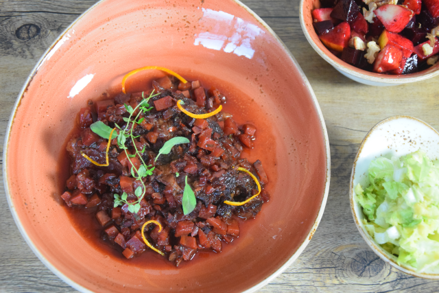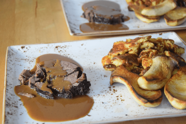 Was der Gurkerl brocht hot: Das waren unter anderem Erdäpfeln und zwar von der Sorte „Rote Emma“, sehr selten, sehr wohlschmeckend, fest und speckig, wie ich das mag. Die Kohlsprossen und der langstielige Brokkoli wurden vorsichtig gedünstet. Das geröstete Wurzelgemüse in der Rein wurde mit frischgemachter Rindsuppe abgelöscht. Der Braten eingelegt … und? – unwiederbringliche Momente der Kochkunst, unvergleichliche Stunden des Hochgenußes, Sternstunden der Kulinarik.