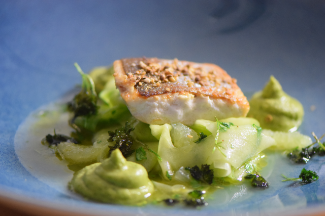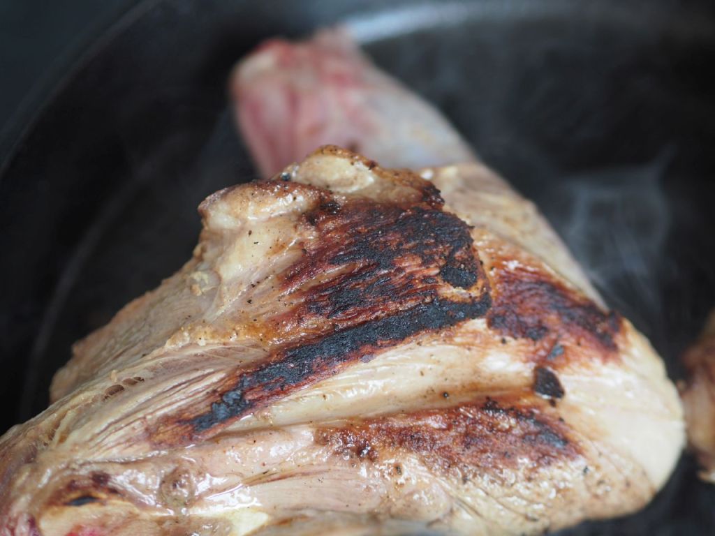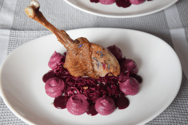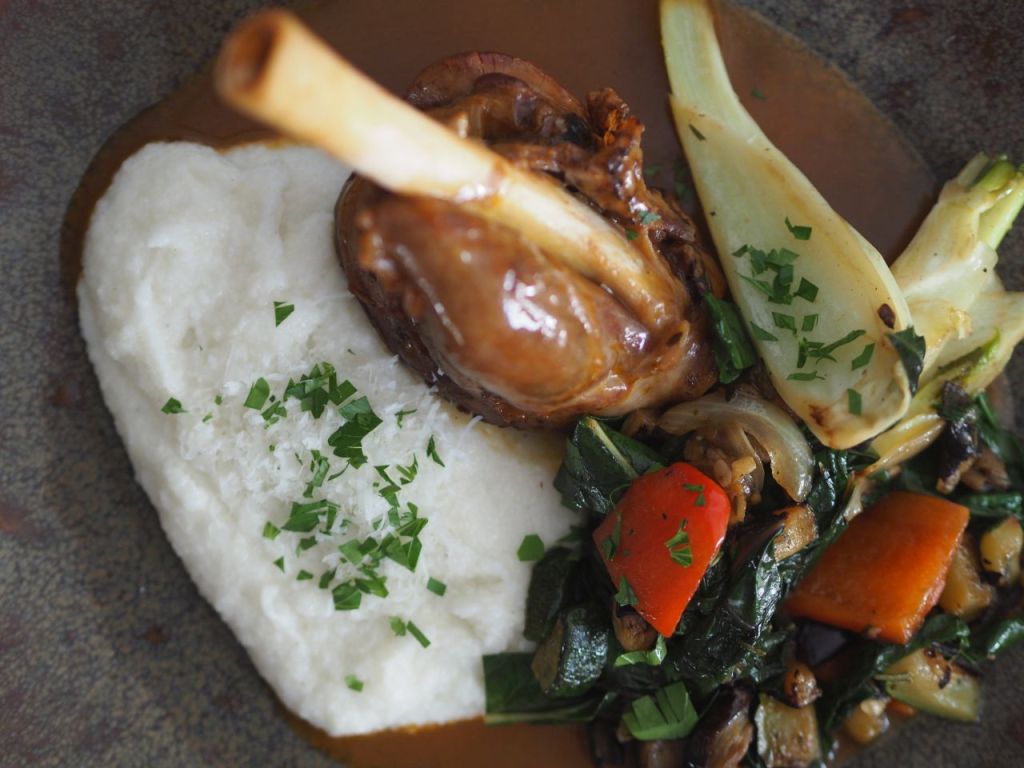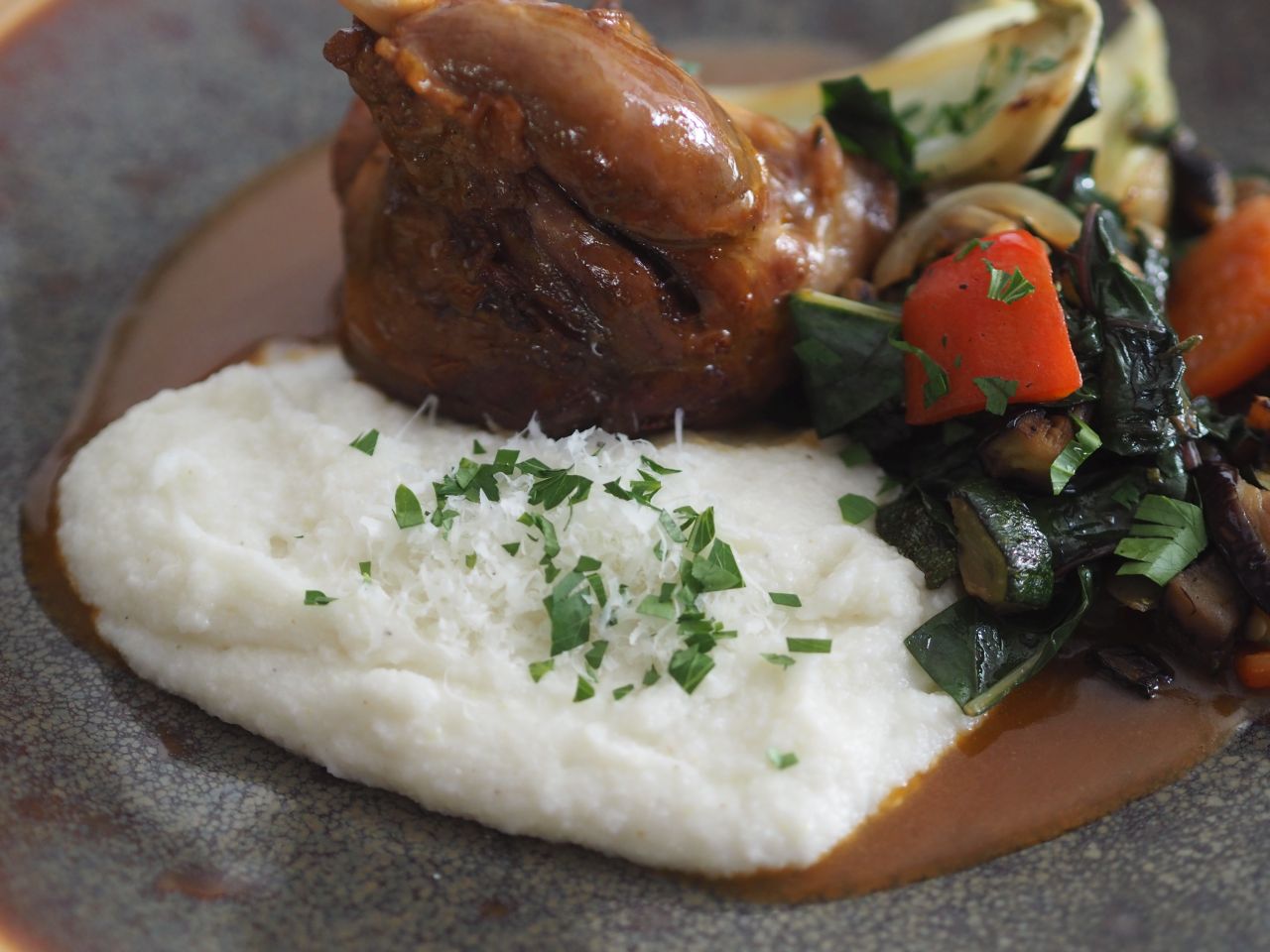 Anrichten: Kalbsstelze mit Kartoffeln, Kohlsprossen und Brokkoli